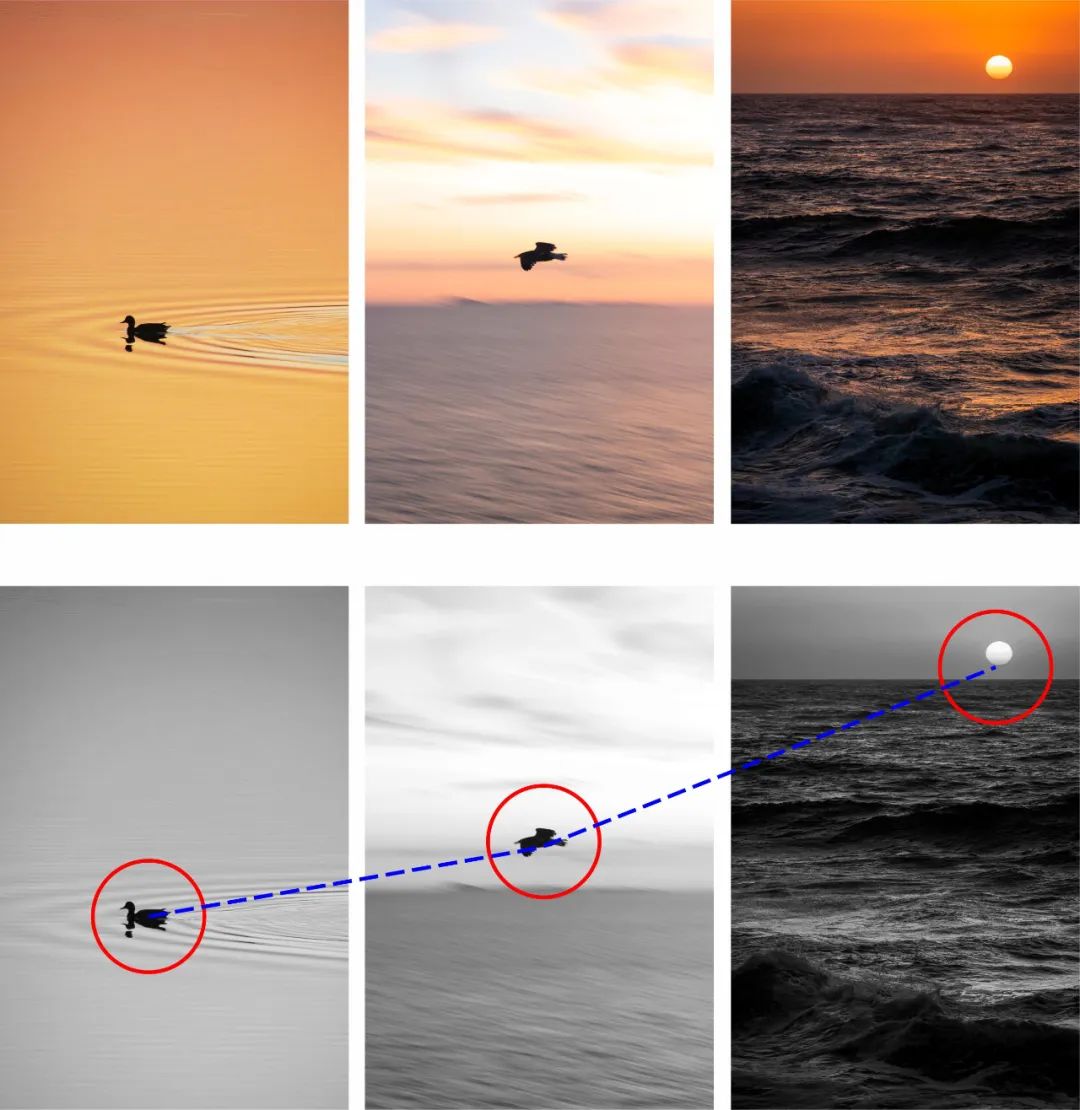 这三张摄影图都是比较纯粹的画面,我们可以看到,画面中的鸭子,飞鸟和太阳都是焦点,画面中的点其实是相对而言的,鸭子相对于湖面,飞鸟相对于天空和海面,太阳相对于海面和天空来说都是点,海面和天空属于面。