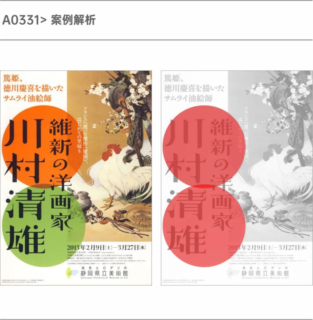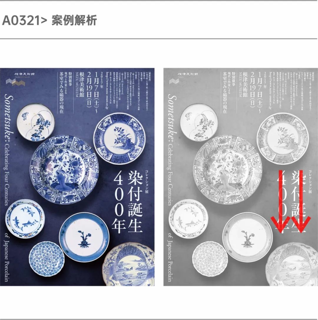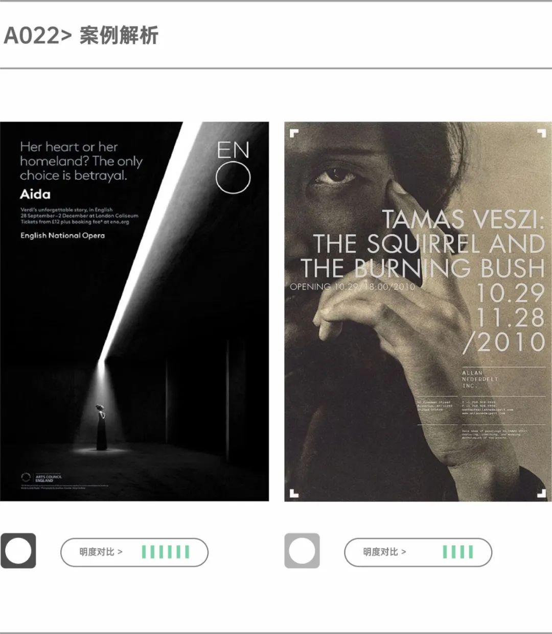 这两张海报在色相上的对比鲜明,一个背景为绿色,另一个背景为蓝色,但是如果将其转化为灰度时,会发现其实明度差是很接近的,所以两个画面在文字信息的识别性上几乎是持平的。