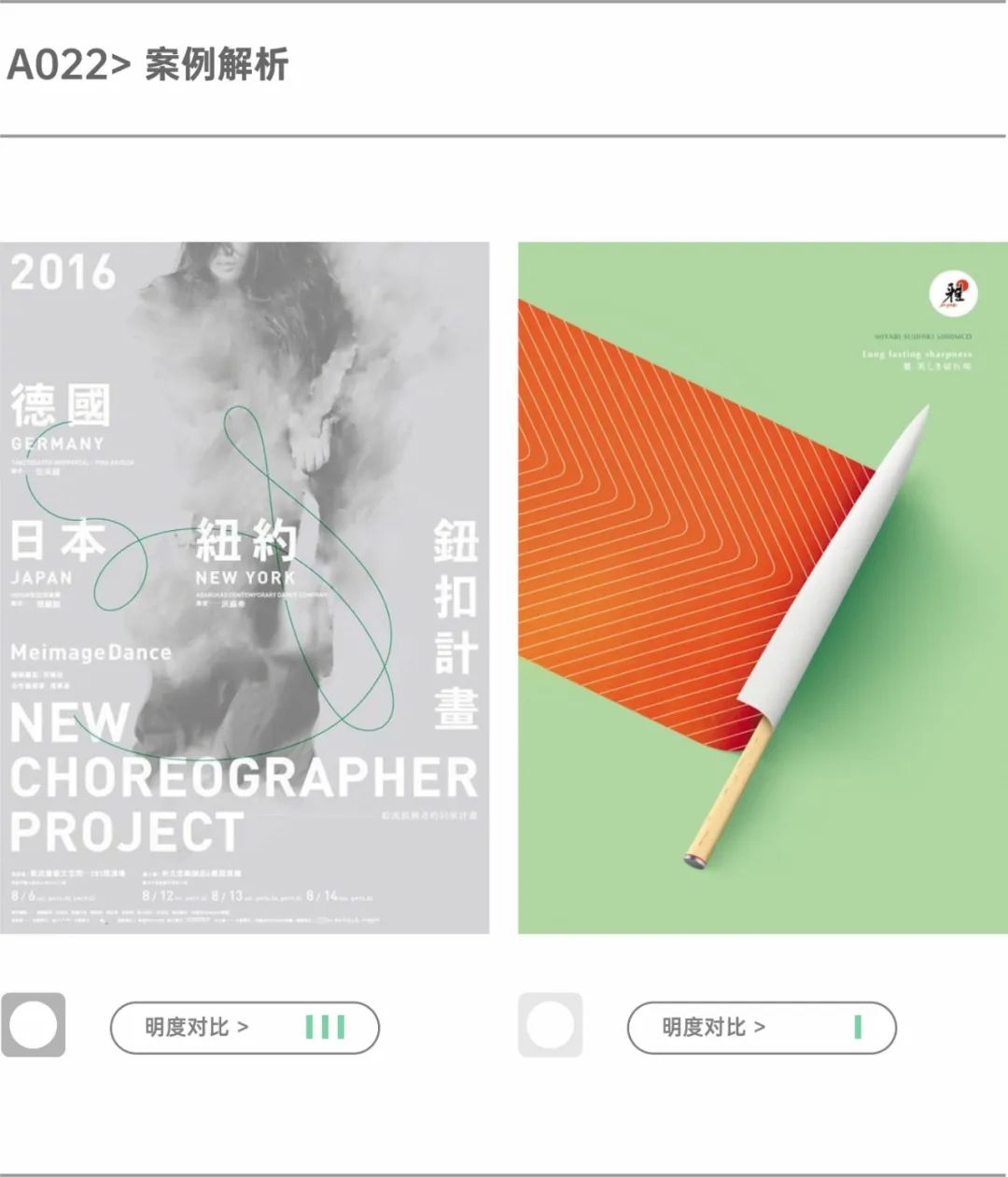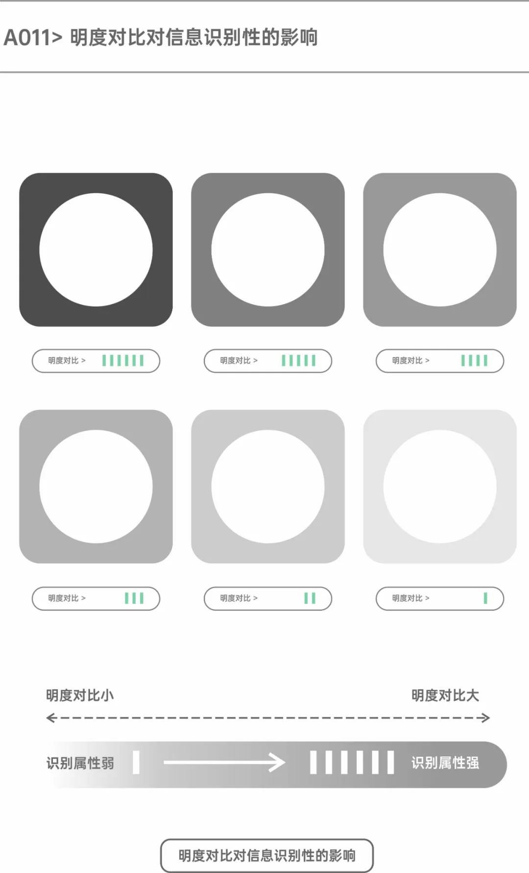 白色圆心代指文字信息,不同的灰度代指画面的背景,通过上面的图表对比,可以看到文字与画面背景明度对比小,文字的识别属性就相对较弱;文字与画面背景明度对比大,则识别属性就相对较强。