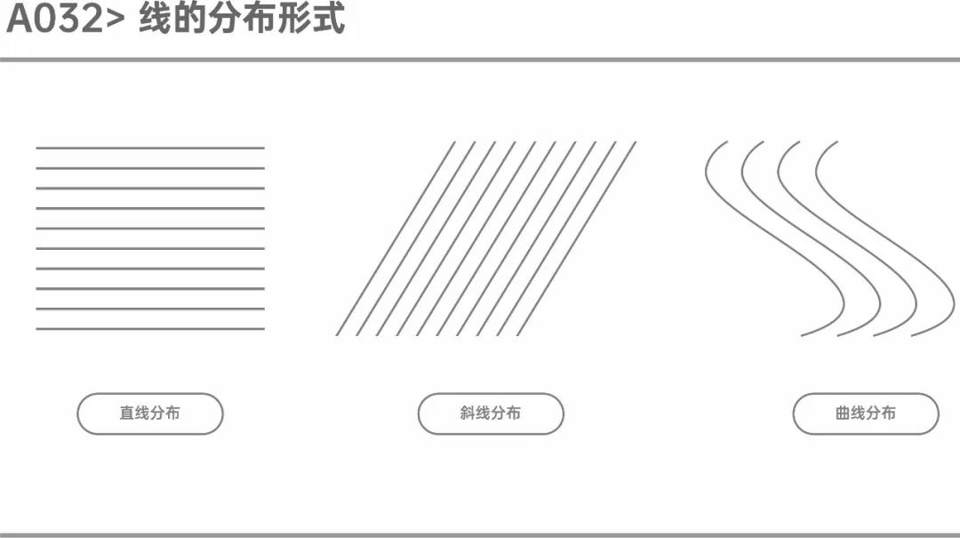 与点不同的是,线更具有引导性与指示性,在分布形式上大体分为直线分布,斜线分布以及曲线分布,直线给人以正式,稳定的感受,斜线多了一份动感,活泼,而曲线则给人以柔和,婉转的心理感受。线在文字信息的识别性上,要比点更高一些,阅读上更加流畅。