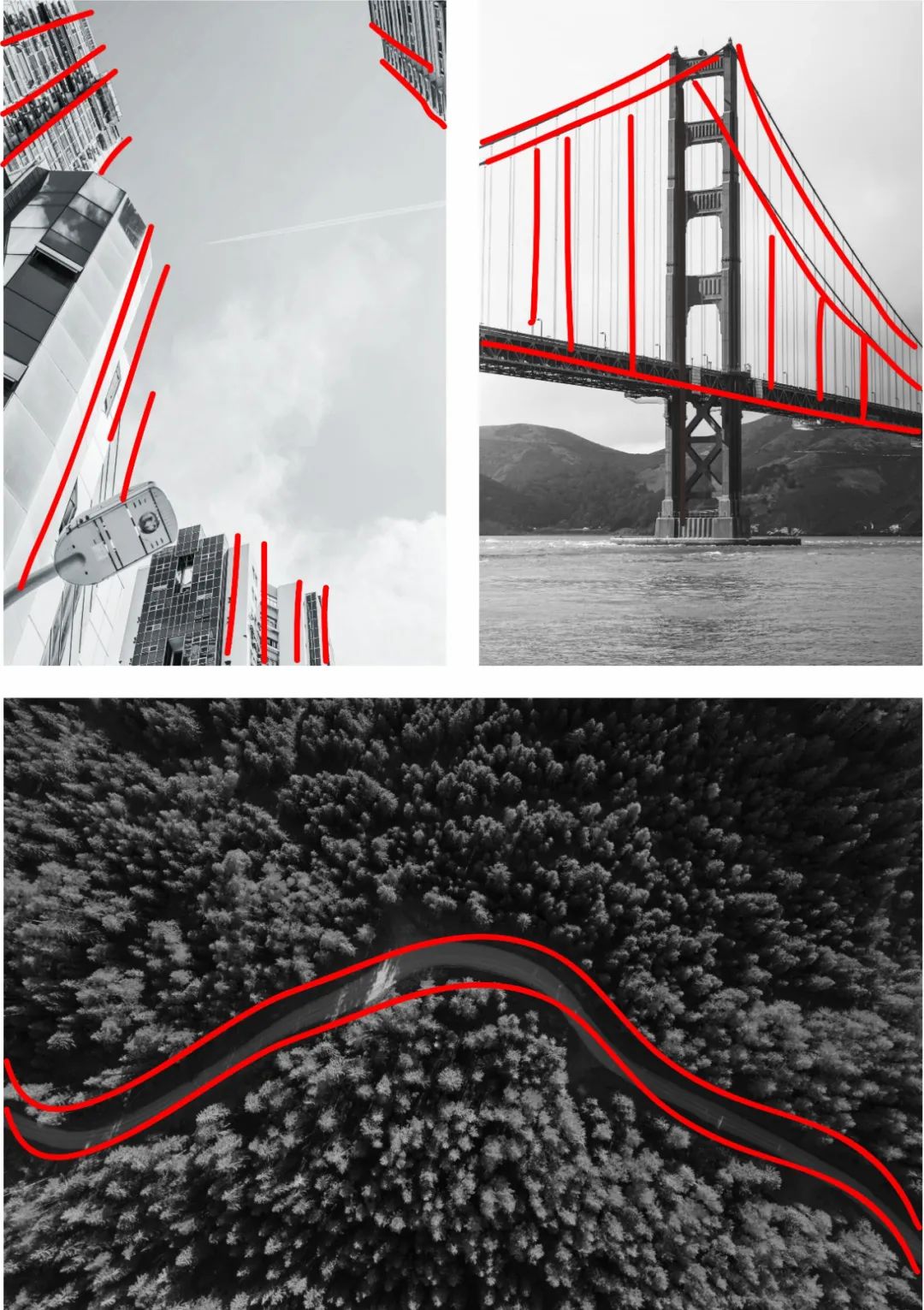 如上图,在生活中存在着很多的线元素构成,比如建筑物群,垂直的线给人以挺拔高大的感觉,大桥上的直线与曲线,直线更有支撑力,曲线更有韧性,包括森林中蜿蜒盘曲的公路,给人以柔和婉转之感,线的引导性和指示性以及灵动性比较好。