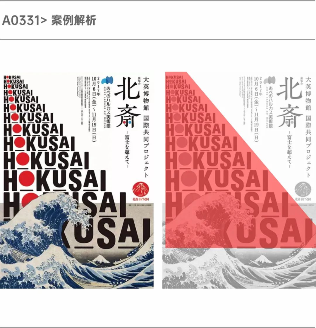 海报中最醒目的区域,就是和浮世绘海浪叠压的视觉文字信息,整体以三角形的分布形式,从远到近形成了大小对比关系,拉开了空间层次,重复的单元强化了视觉印象,识别性也相当好。