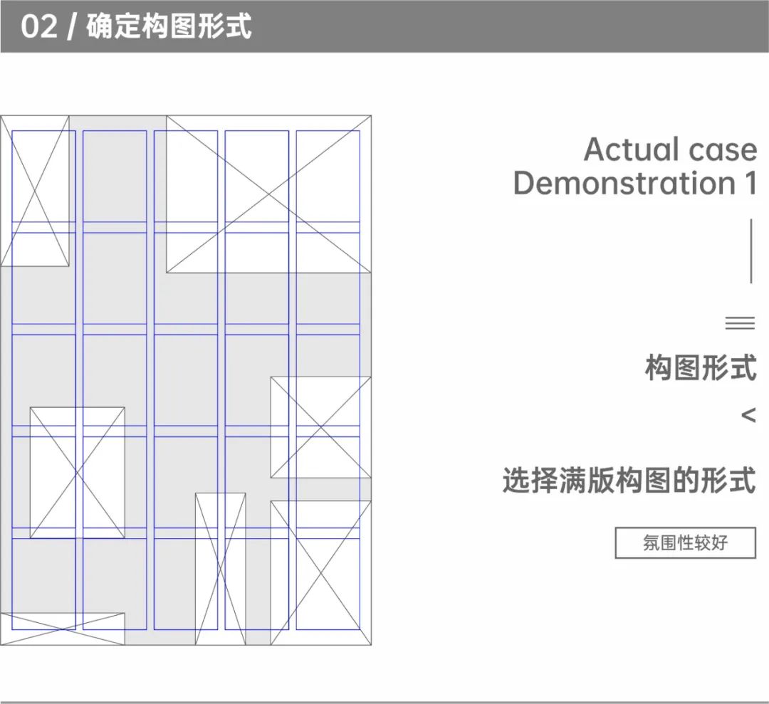 先划分空间,确定构图形式,这里选择了满版构图的形式,绘制网格系统,大致确定图片的位置,自由分布即可。