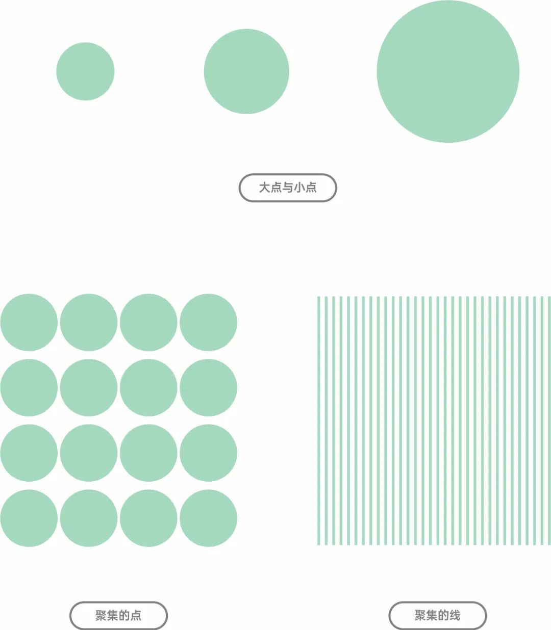 站在点元素的角度上,越大的点越趋向于面,越小的点越趋向于点,所以在一个画面中往往大的对象会相对看成面,小的则看成点,而面的形成也可以通过点的聚焦或者线的聚集而成,都可以看成不完全闭合轮廓的面。