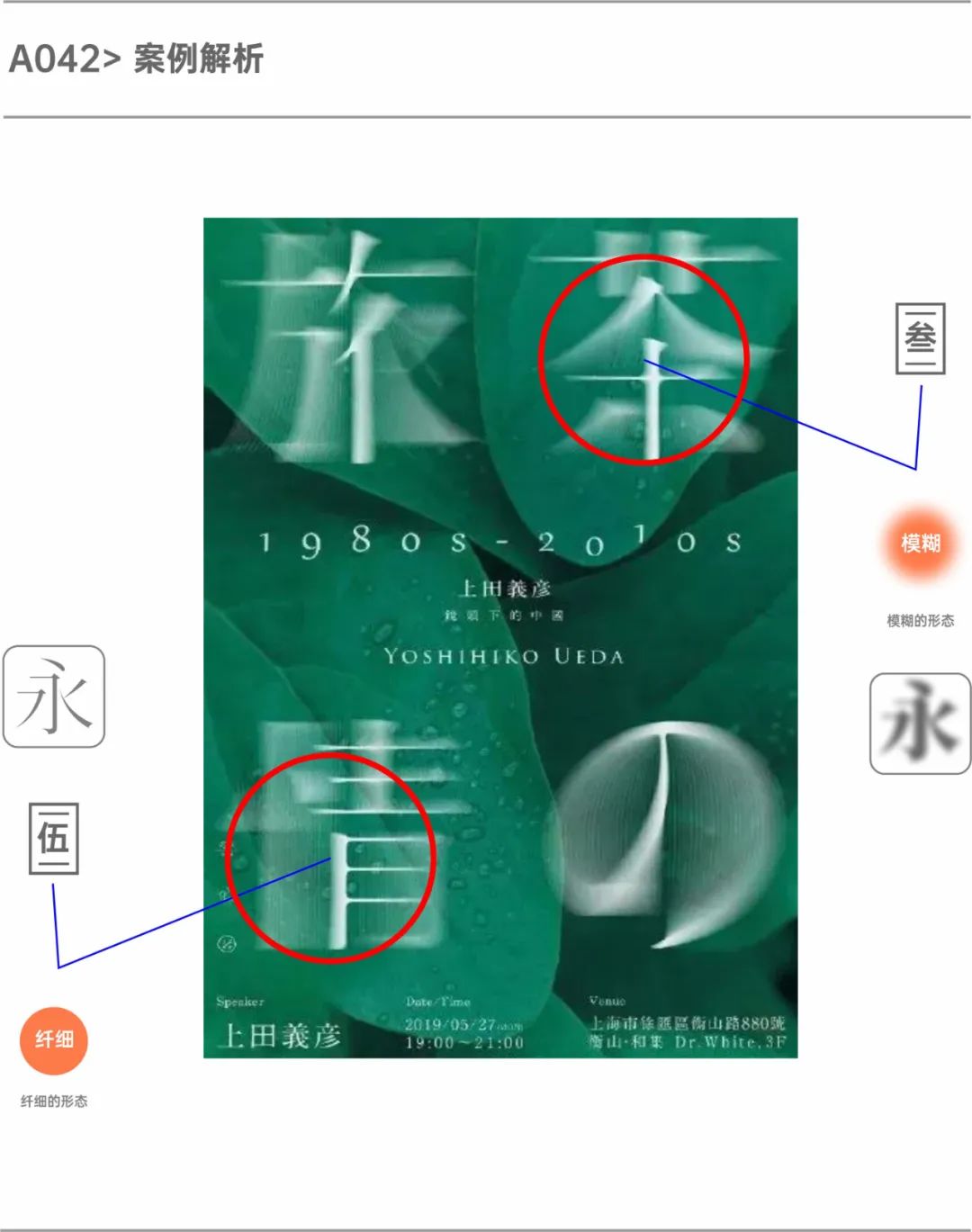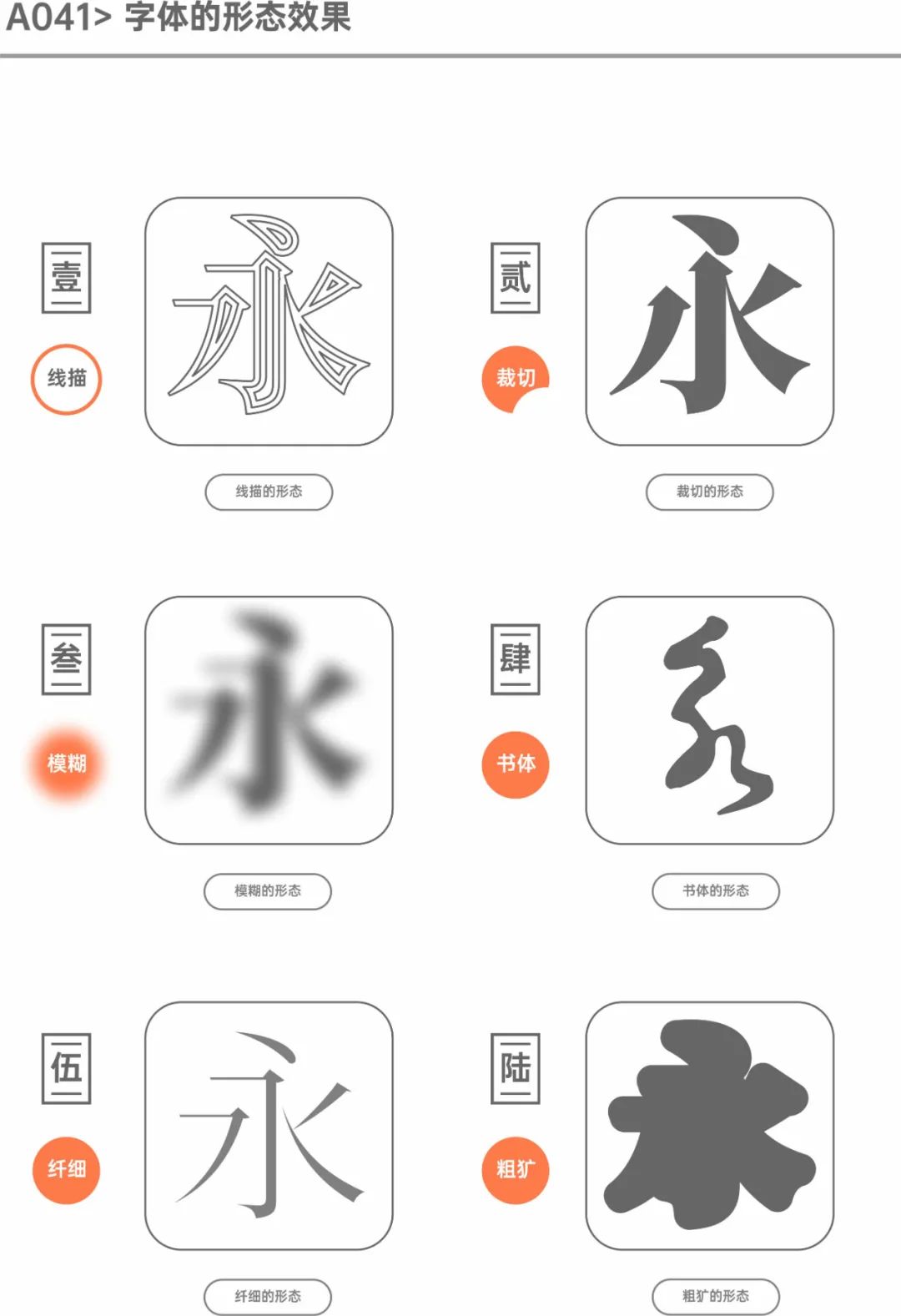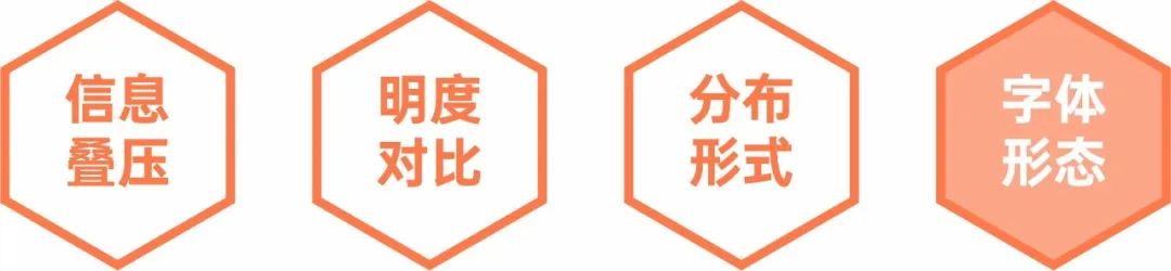 字体形态指字体用的特殊形态效果,比如描边,二次设计,裁切,模糊等,以及字型本身对信息识别性的影响。