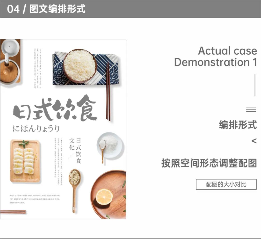根据空间的形态选择相应的配图,由于图片比较多,所以可以根据空间的形态去调整图片的方向或者大小,裁切或者遮挡即可。主标题选用的是手写体,日字笔画比较少,所以缩小一些,食字笔画多,可以放大一些,字体的内白控制更均匀。