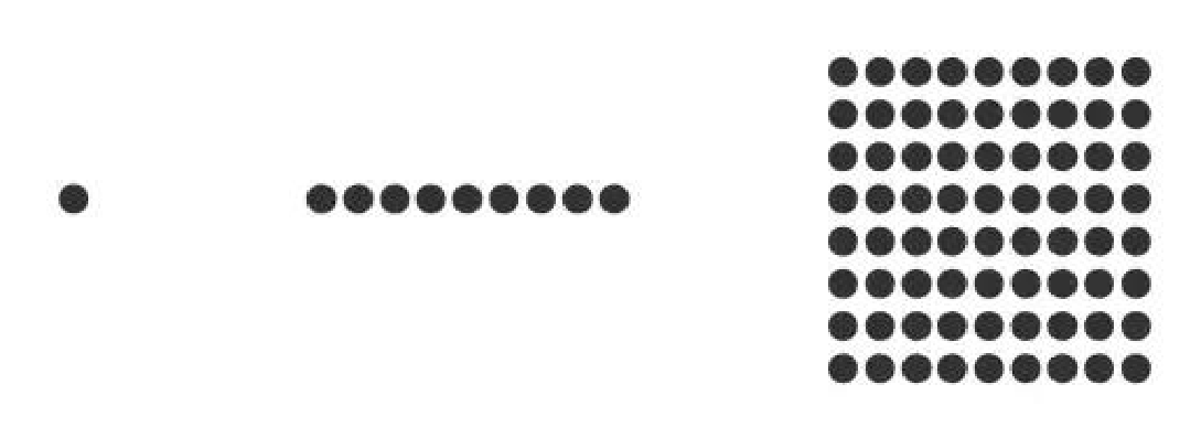 点成线,线成面,点是几何中最基本的组成部分。点的排列和组合也会产生线的或面的视觉移动。如两个以上的点排列时, 我们发现点与点之间存在着一种看不见的线,并且会产生运动和方向的感觉,这种现象叫做点的线化。点的密集排列也会产生面的感觉,这被称为点的面化。