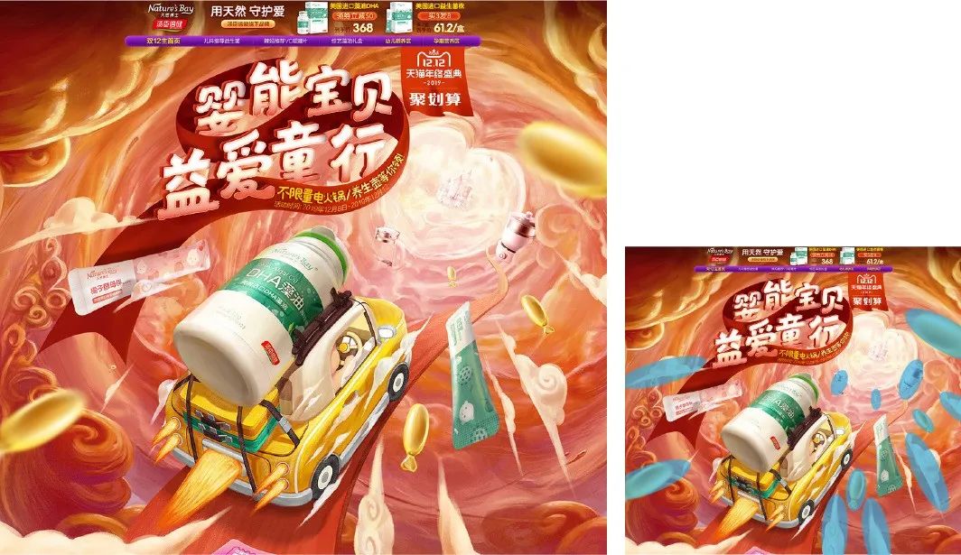 点还具有烘托气氛的功能,使用大小各异,高低不同的点元素加以烘托,画面会出现跳跃、动荡、欢快的视觉感受。如下图,使用飘飞的糖果和云朵的点元素,形成了非常具有节庆氛围的促销页。
