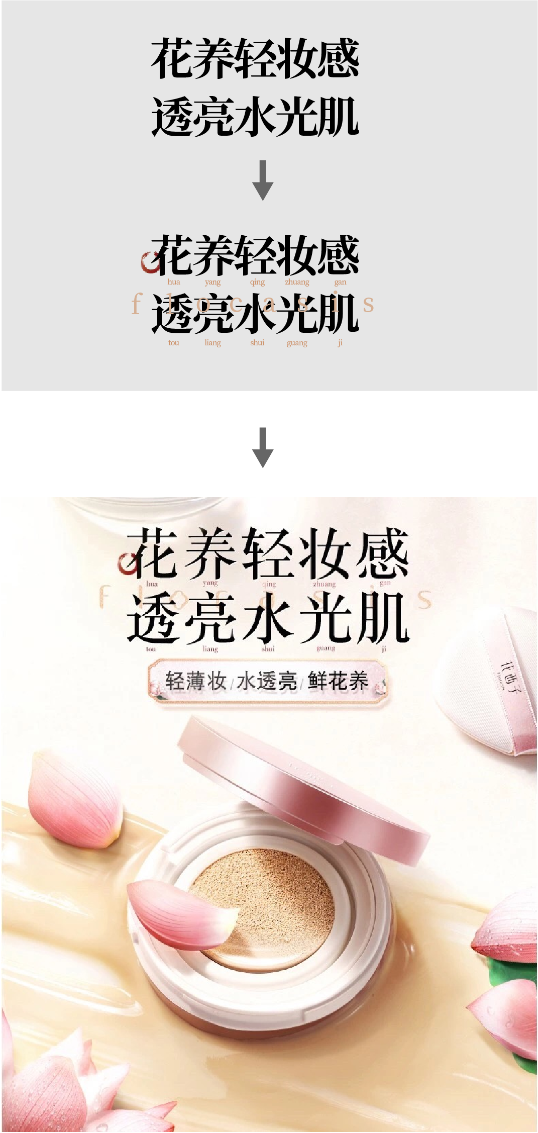 在排版中,各种文字、小图形、图标、装饰性字母或标点符号等,都可以理解为点元素。如下图,在标题中加入英文和墨迹,在标题下方加入拼音,可以让标题增加对比,使细节更丰富。