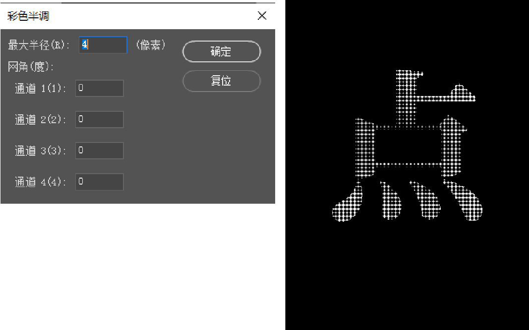 执行“效果-像素化-彩色半调”,把“最大半径”改为“4”,“通道”都改为“0”,得到点状化的文字主体,与设计主题呼应。