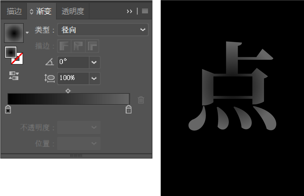 接下来进行主体的刻画。右键选择“创建轮廓”把文字转化为曲线。加入黑色到灰色的径向渐变。