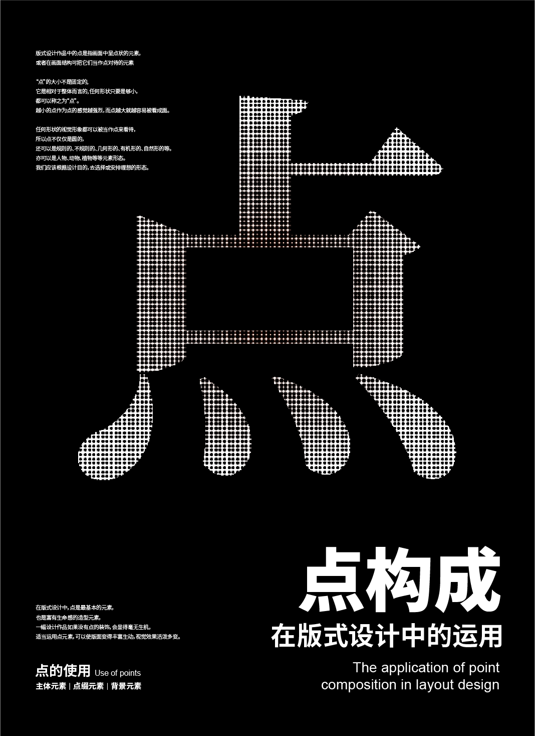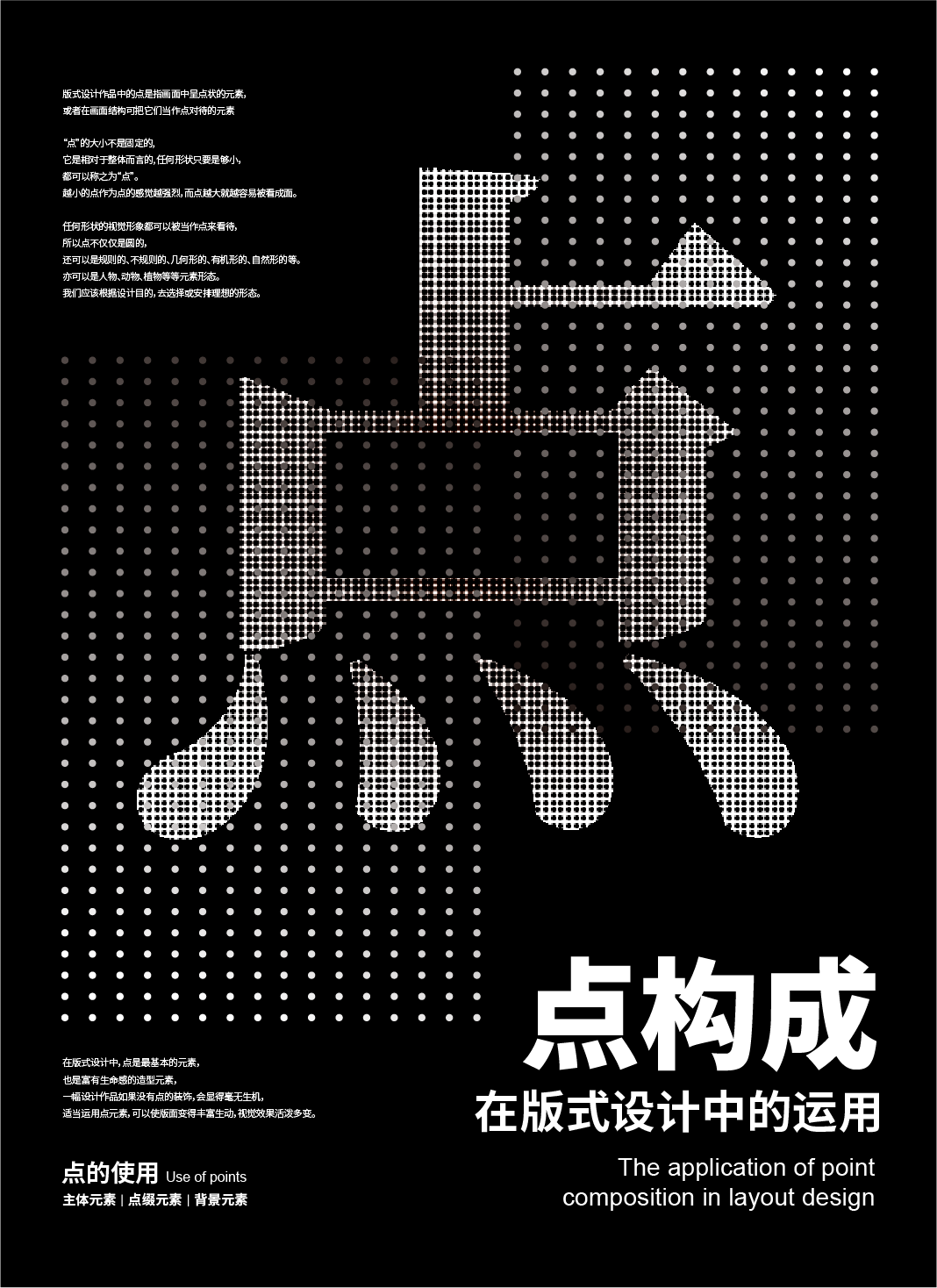 多个点聚在一起,通过疏密、聚散、连续、渐变、大小、重复和数量等变化,构成生动的图案,也可以做为画面的主体。