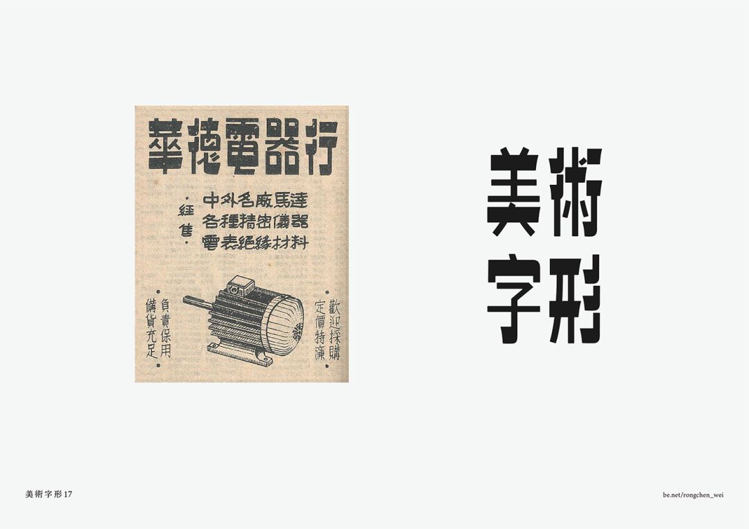 美术字是一种运用装饰手法美化文字的书写艺术,以一种独立的姿态兼并传统艺术,并带有商业文化的特质积极加入到中国汉字艺术文化范式的再造过程中。广告中的美术字可谓是近现代美术字案例的巨大宝库,不同的字体类型,不同的风格,不同的组合形式,反映出当时人们对于字体革新、商业环境影响与审美方式诉求的状况。
