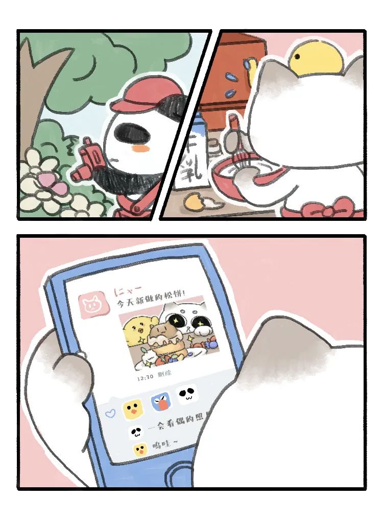 小熊猫和纯真猫是一对神奇的小伙伴,虽然住得很近,但由于一个爱玩,一个爱宅,所以很少见面。直到有一天,纯真猫采购回家,正好遇上拿着行李箱的小熊猫,它们便火热地聊起来,还互加了微信。