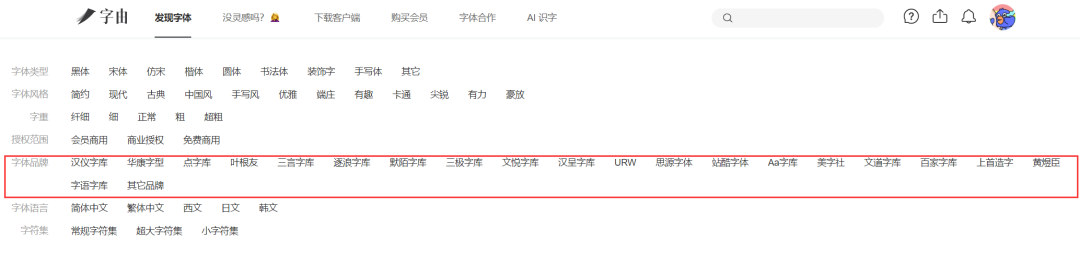 最近还增加了一个模块,以前在发现字体中才能筛选到的字体品牌。