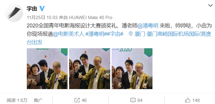 本周三,柚子参加了2020全国青年电影海报设计大赛颁奖礼。没错,就是8月份发过的那个活动,不知你参加没有?入围没有?得奖没有?不过这都不重要,重要的是,本次大赛的字体支持是字由,眼尖的小伙伴,很快发现了这张铜奖作品,用的就是字由的会员字——点字逸致体。除了获奖作品,颁奖礼上还请了很多艺术大咖,比如许静老师,她的作品你肯定很熟悉,比如还没上映,海报就广受好评的《一秒钟》。另外一位马德帆老师,她设计的《八佰》“千疮百孔”,不知震慑了多少人。由此可见,一个好的片名设计,对影视作品越来越重要了,因为它能通过不同的笔势,感染观众,代入观众。这里面不得不提的就是潘粤明,他主演的三部鬼吹灯系列,都是自己设计片名,之前还特意写过怒晴湘西。只是柚子没想到,活动现场真的见到了潘神,立马不淡定了……