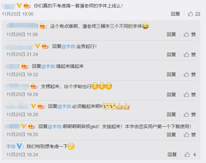 很多小伙伴还说出了字由的心声,那就是想让潘老师出套字体(梦想还是要有的,万一实现了呢)。不过有一说一,字体可比写几个字难多了,如果没有大神的手,就买字由会员吧,效果也很惊艳!