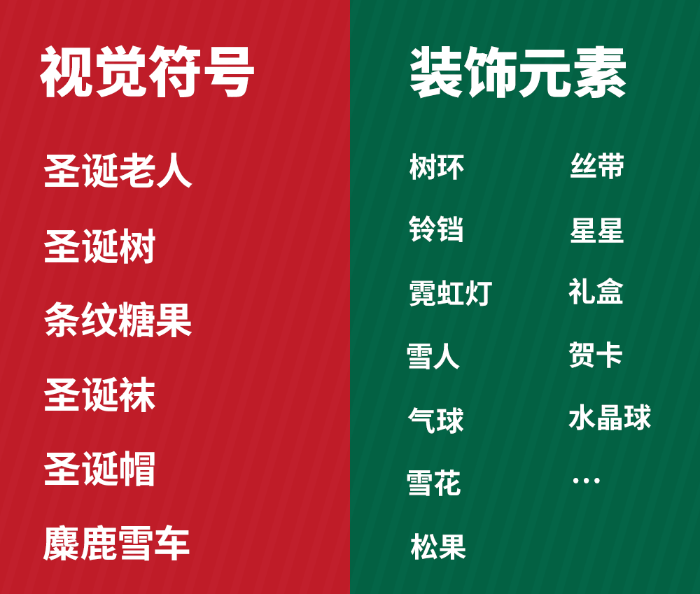 也许我们能想到上面这些与圣诞相关的视觉元素,但不同的视觉元素之间也会有本质性的区别,所以进行简单的分类。