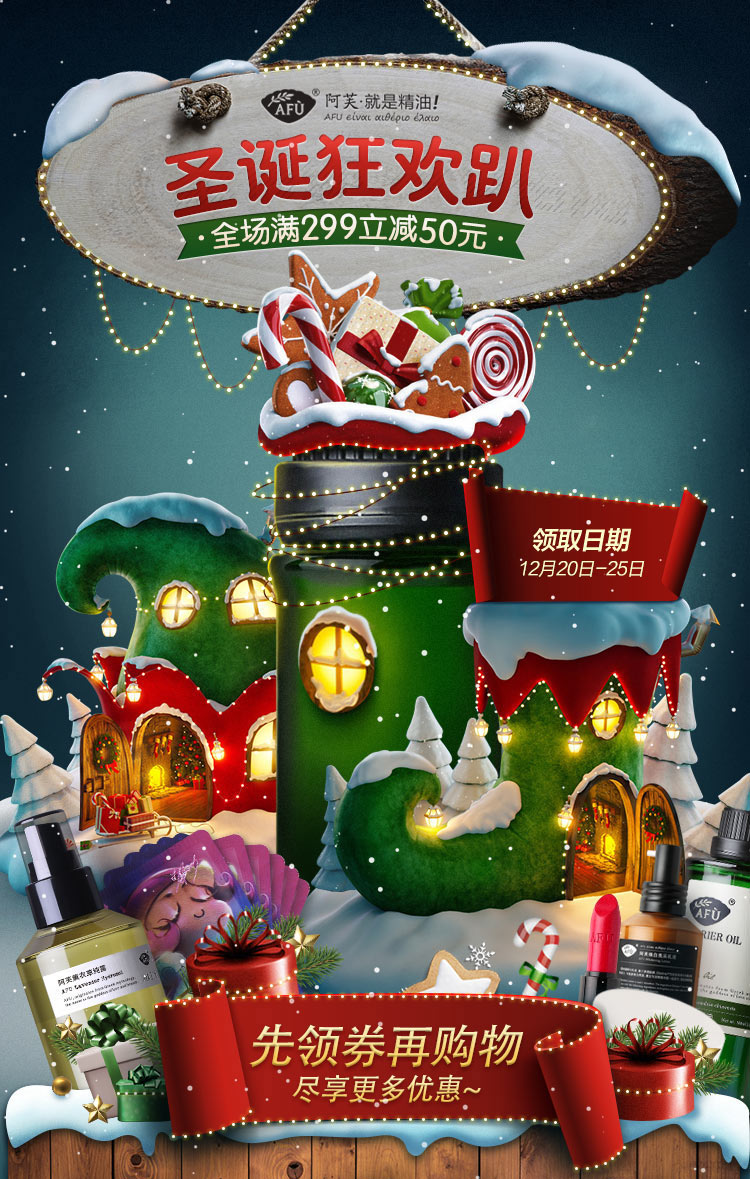 合成手法在设计工作中用到的非常多。在圣诞节专题设计中,同样可以利用合成的手法搭建与圣诞有关的场景,再融入产品、文案元素。