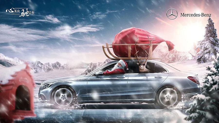 这是奔驰为圣诞节制作的海报,以圣诞老人送礼物为故事主题,既能体现出圣诞节的氛围,又给用户一种非常有趣的感受。