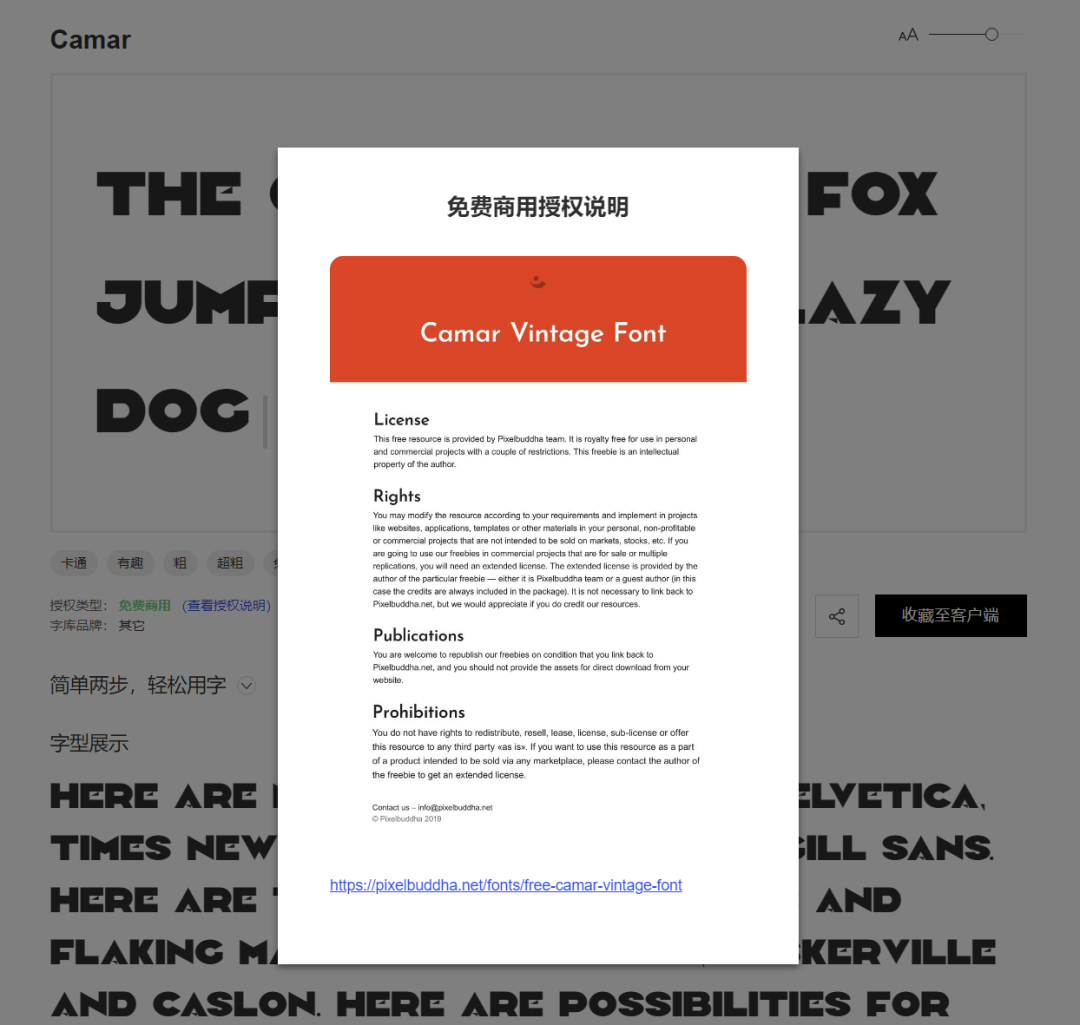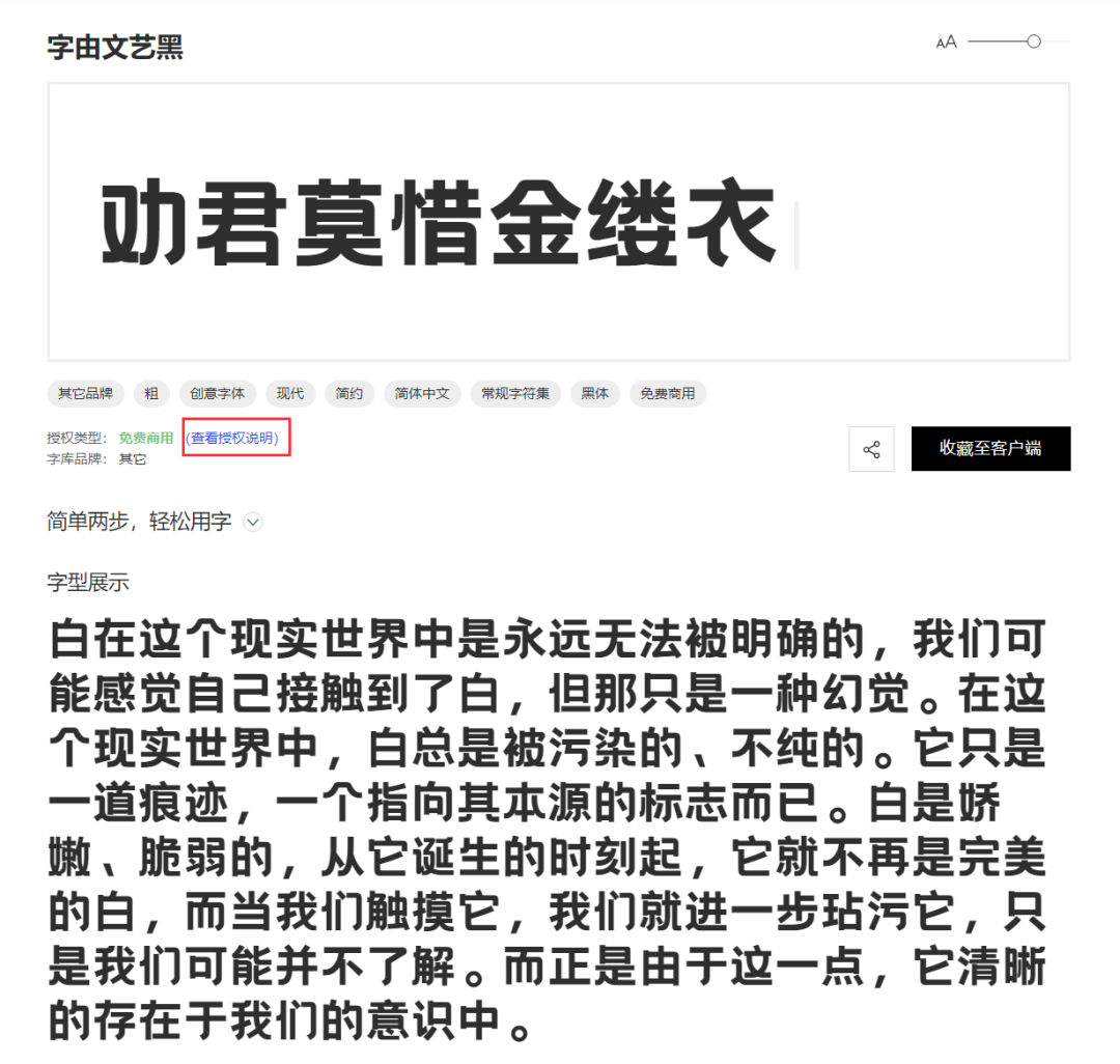 首先是上次在年终福利里提到的版权来源&出处,如果你担心免费字体的真伪,可以点击免费商用右边的小蓝字,直达声明链接。