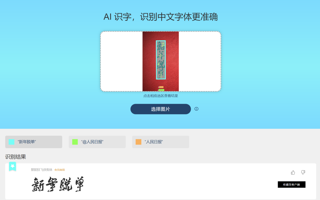 就找到其中一张上传,识别出来正是会员字体——默陌狂飞侠客体。