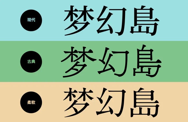 首先要过的第一关当然是汉字字体的选择了,毕竟西文字体也是根据汉字的字体类型来搭配选择的。对于梦幻岛这三个字,显然宋体字会更加满足我们对「梦幻」二字的想象。