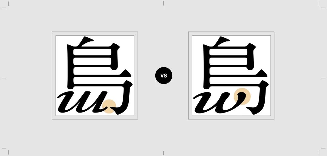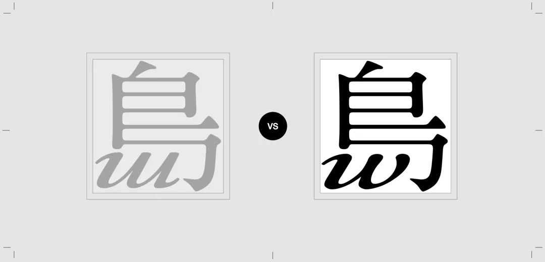 接着我们就需要针对逐个问题进行修改。这里我们用这个绿色的线框去表示修改前的样式,黑色的字代表修改后。经过结构上的调整,我们对比绿线和黑色的部分,可以看到调整后的文字结构明显要更稳定一些。