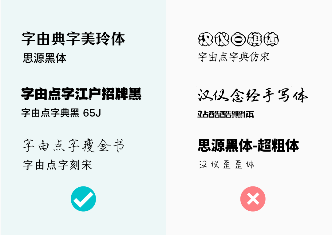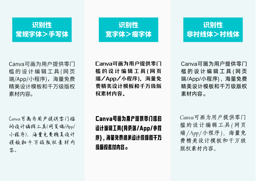 在选择字体时也要充分考虑信息的可读性,手写体等不易阅读的字体仅放在大标题中,不适宜在正文中应用。