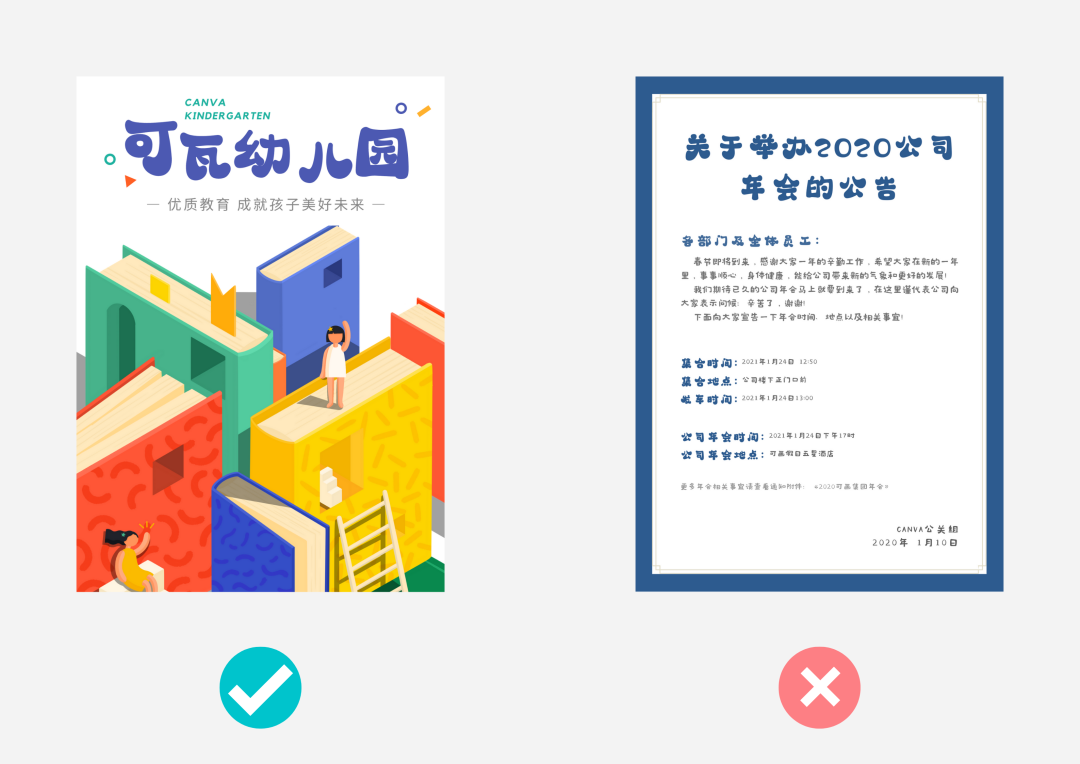 注意选择与设计情绪调性相符的字体。比如圆体用在儿童宣传物料中就很合适,而用在公司通知公告中就十分违和。