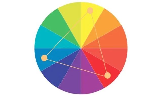 在色环上呈正三角分布的三种颜色组合,如红黄蓝。如果需要一个活泼的三色配色方案,可以试试这种~