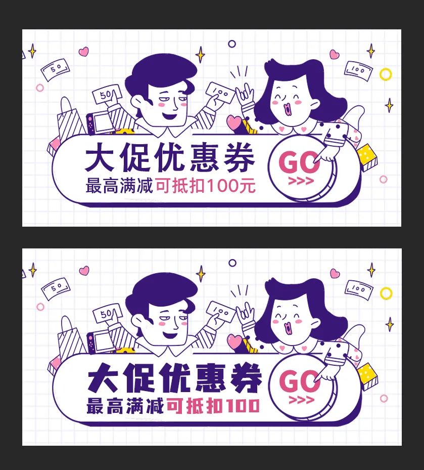 “大促优惠券”是应该突出的信息,配合可爱的插画风格,当然应该选用更加突出还有设计感的优设字由棒棒体啦~
