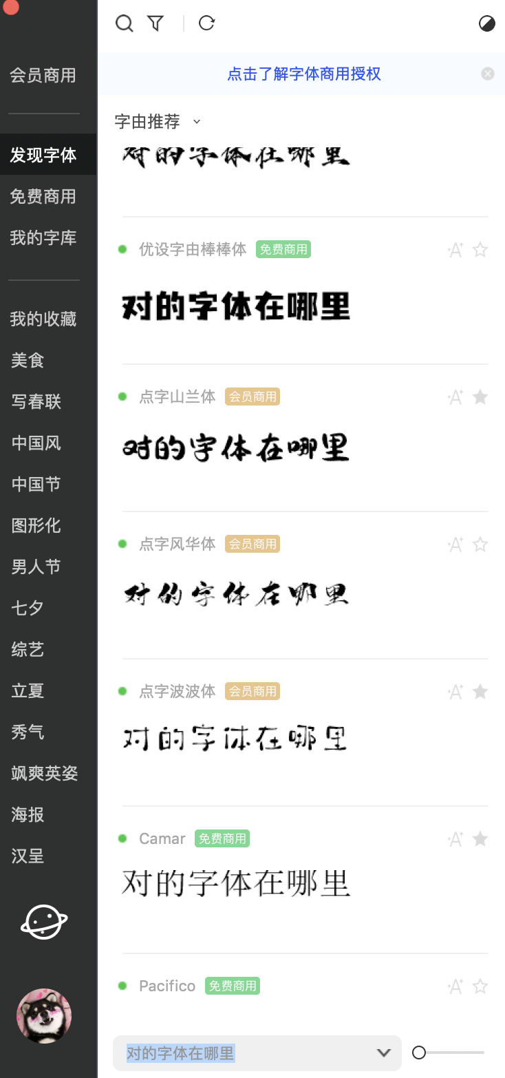 字体的选择真是一门学问,好在字由帮大家最大程度上简化了这件事~想要找到合适的字体,只需要在客户端的最下方输入你的文案,一个个看就好啦~总能找到一见钟情的那一款~