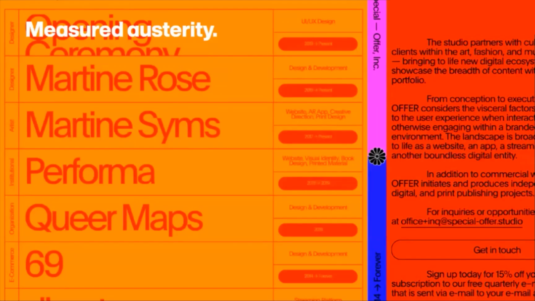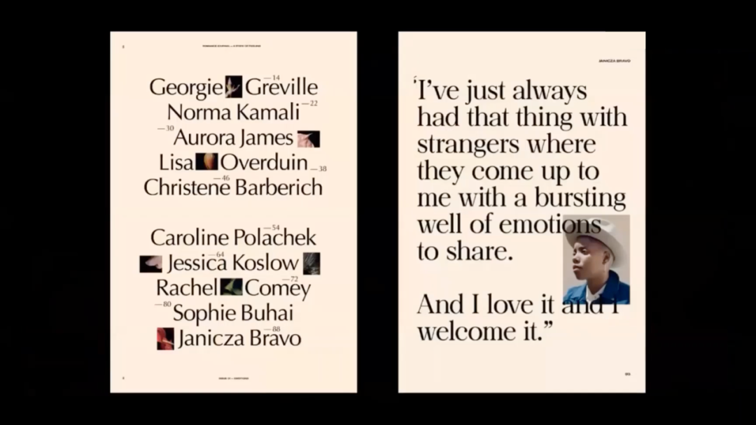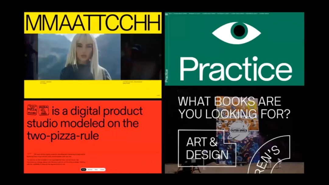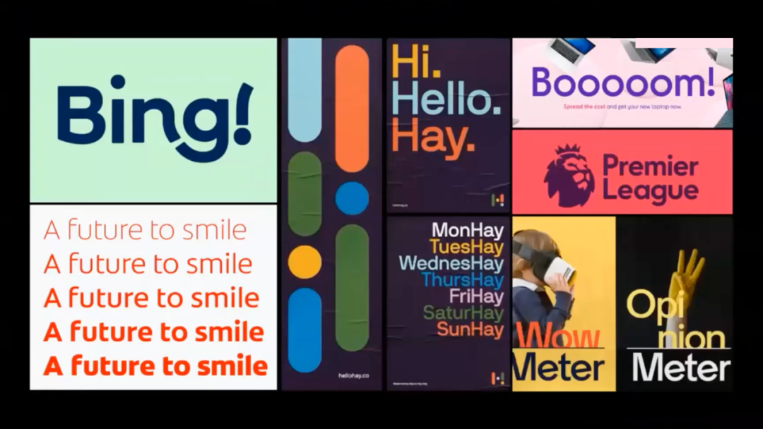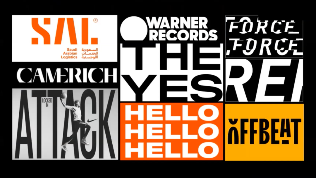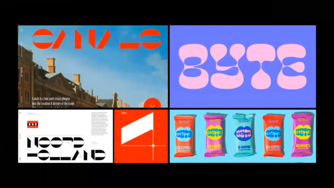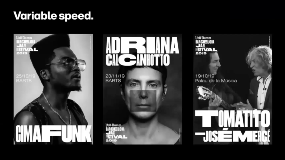 字母造型拉伸或压缩,结合不同字重的应用,形成或快或慢的速度感。这样的文字编排方式在 20 世纪一度流行,但如今可变字体的出现为这一趋势带来了全新的可能性。通过可变字体,不同样式字体之间的界限被打破,设计师得以进行更多的动态设计或实验性探索。
