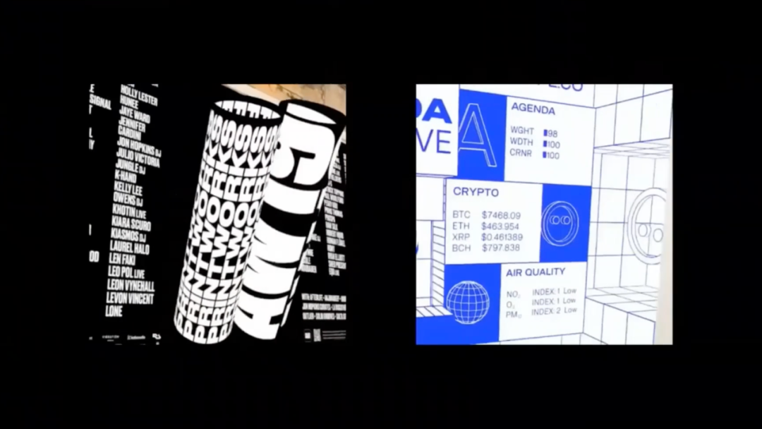 通过 VR 和 AR 技术,品牌可以探索和字体交互的全新方式。字体可以结合在建筑空间中,根据参与者的位置和观看角度发生变化,与其产生互动。混合现实已经被应用在了生活和娱乐中,这同样会对文字设计提出要求。出现在现实空间的文字,也需通过设计来确保其可读性。5G 的发展也将让更多的动态文字设计以虚拟现实的方式呈现。