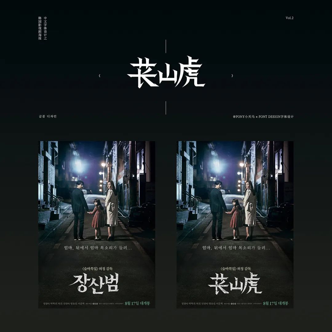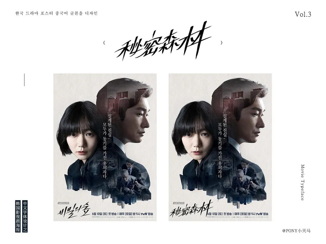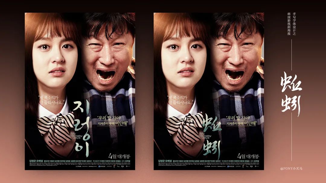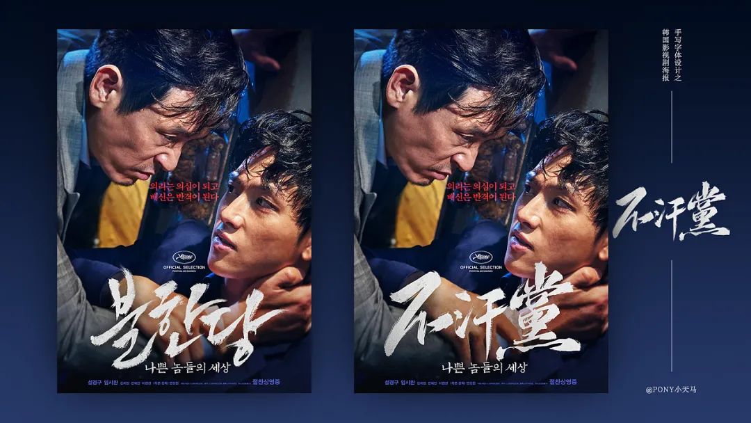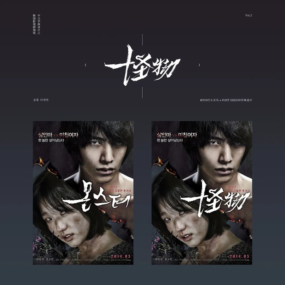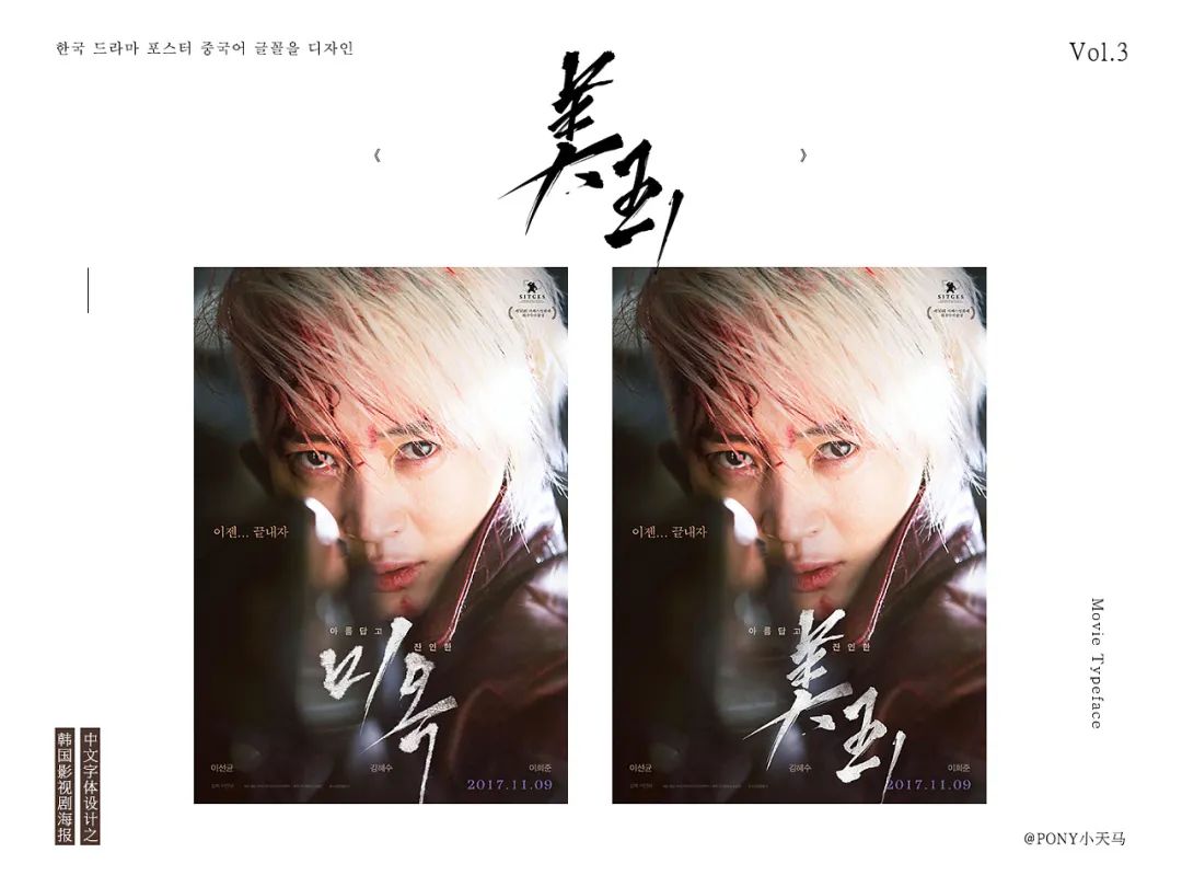 emmm,不能说一模一样,只能说毫无关系,韩文表达的那种邪恶、尖锐,到了中文,完全被磨平了棱角。其它韩剧也是一样,打上中文字体只是为了识别,至于气质配不配,完全不在考虑范围内,毕竟只要不侵权就行(大部分用免费字体),呃,好好一韩剧,就这么被“改装”成了低成本网剧的既视感😭不过最近柚子刷站酷,发现了一枚宝藏字体设计师PONY小天马😎经过他手的字体设计,完全保留了原版海报的味道,看了以后毫无违和感,简直想要疯狂打call!比起韩剧,韩国电影的海报更有意境,字体就是表达情绪的最好窗口。还有更多作品,你可以直接去站酷看PONY小天马哦🌈