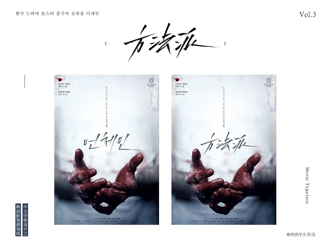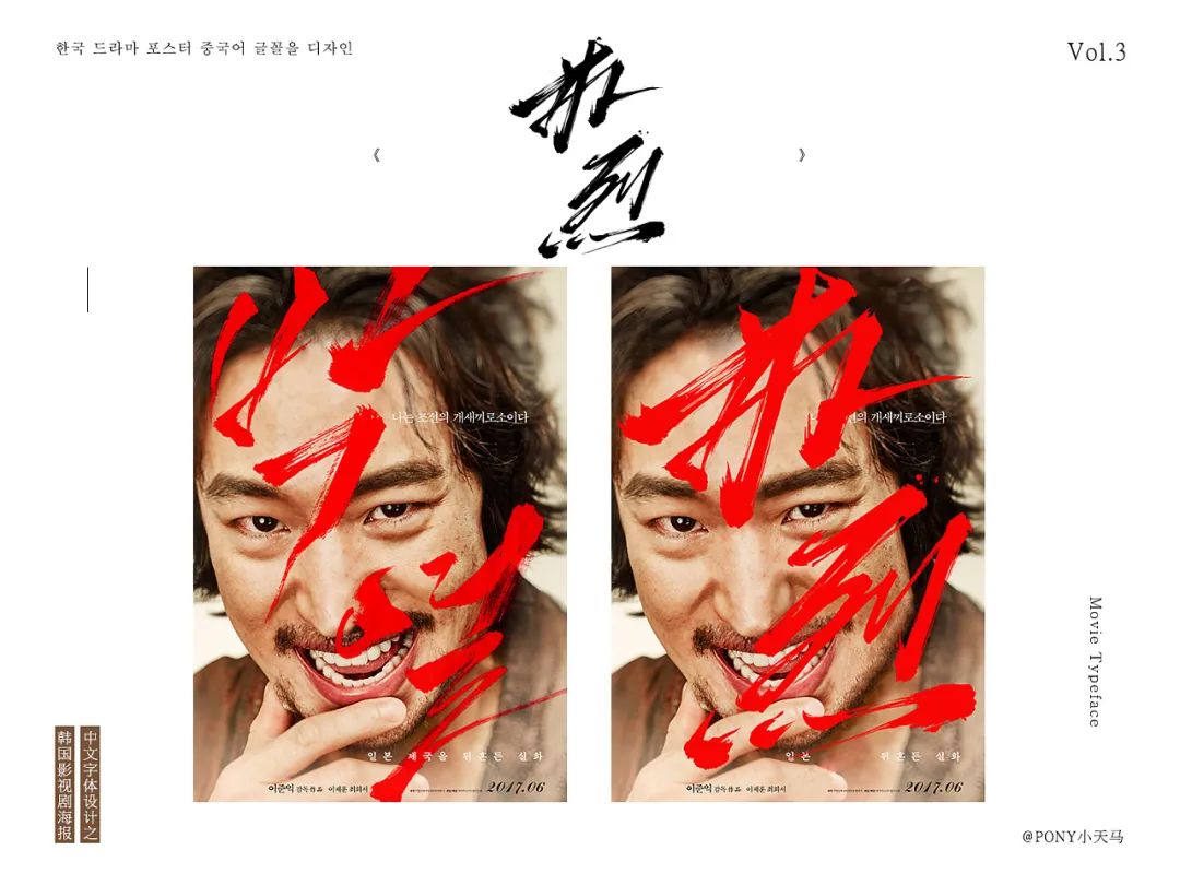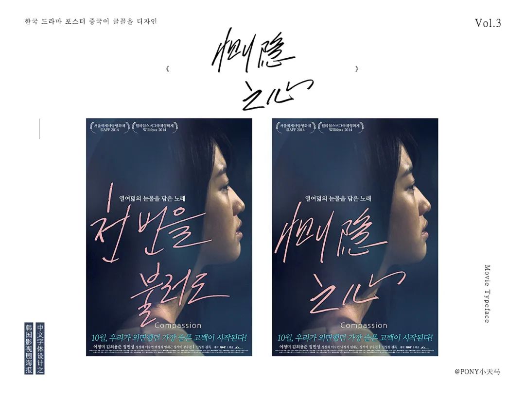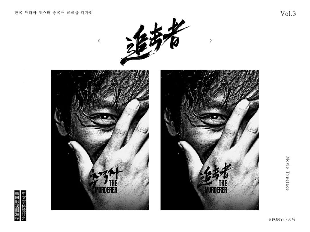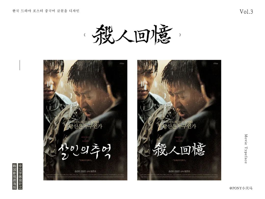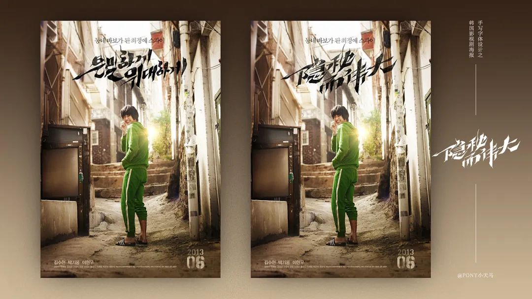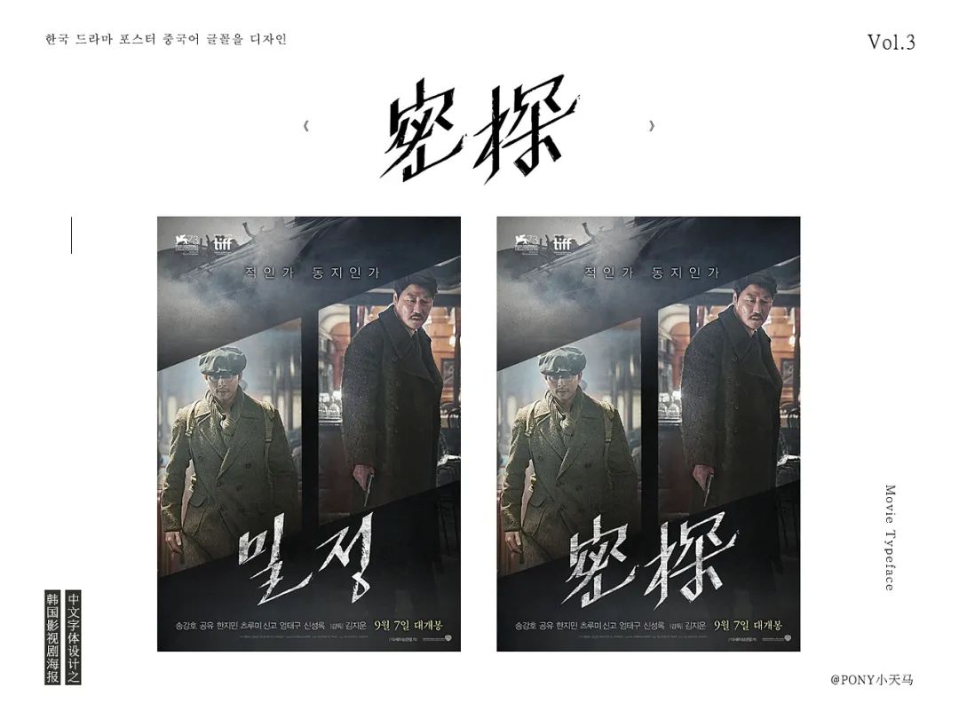 emmm,不能说一模一样,只能说毫无关系,韩文表达的那种邪恶、尖锐,到了中文,完全被磨平了棱角。其它韩剧也是一样,打上中文字体只是为了识别,至于气质配不配,完全不在考虑范围内,毕竟只要不侵权就行(大部分用免费字体),呃,好好一韩剧,就这么被“改装”成了低成本网剧的既视感😭不过最近柚子刷站酷,发现了一枚宝藏字体设计师PONY小天马😎经过他手的字体设计,完全保留了原版海报的味道,看了以后毫无违和感,简直想要疯狂打call!比起韩剧,韩国电影的海报更有意境,字体就是表达情绪的最好窗口。还有更多作品,你可以直接去站酷看PONY小天马哦🌈