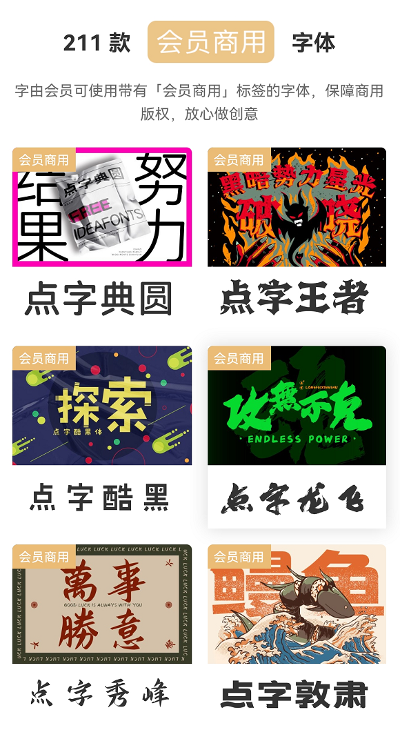 鞋子好不好穿只有脚知道,那字体好不好用,只有设计师懂了,就像女人的衣服一大堆,但真正好穿还耐穿的,就那么几件。所以字由才提供三天的试用会员,让你可以畅享目前这211款字体,尽情地做海报,做出来也不白做(可以终身商用),好用你再买。