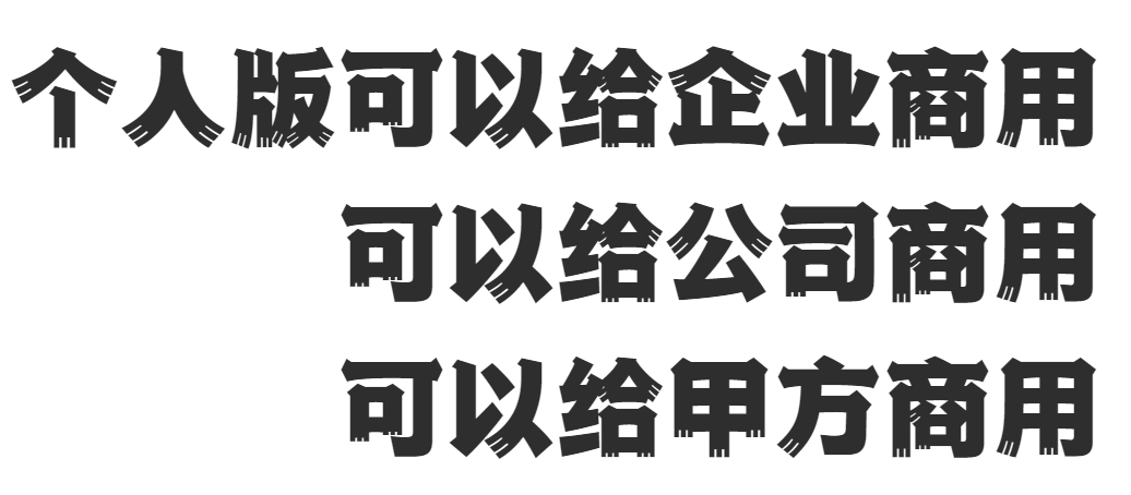 自从字由开始了客户端模式以来,就有无数跟风模仿者,还copy“设计师必备字体利器”,那么好,我格局变大,换成“字由,让设计更有价值”,你就没招了吧。然鹅会员模式开启以来,“个人版”会员这个title,又被市场各种添油加醋,演绎成了个人商用,非企业商用的定义。好家伙,天天要跟用户解释无数次,字由的个人版会员可以给第三方商用(最适合只有一个设计师的小微企业)。