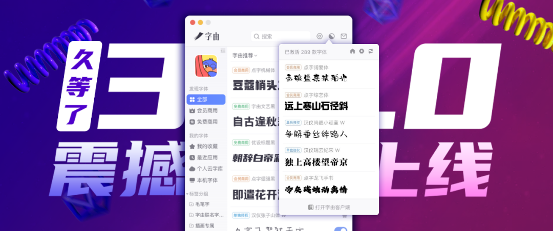 只要你进入设置,选择轻模式,再关闭界面,点击右下角图标,就进入mini版了,可以直接应用已激活的字体,还可以在设计软件的字体下拉列表找到该字体(退出字由则没有哦)。