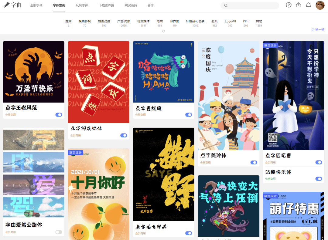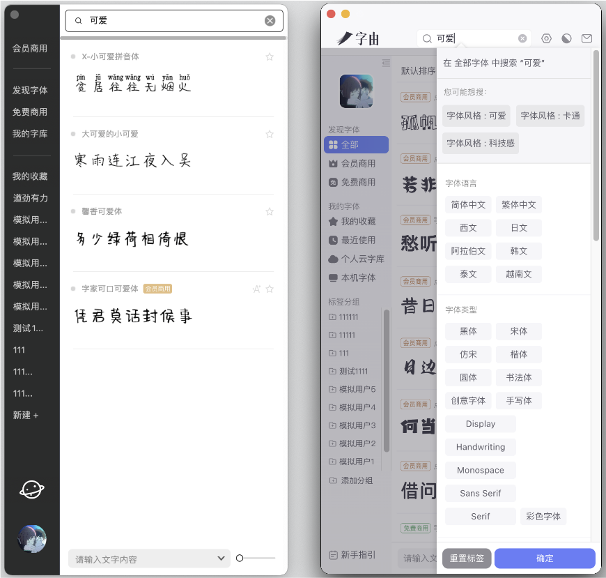 这次3.0还强化了搜索功能,毕竟很多用户不知道字体名字,只能通过形容词来搜索,所以之前你输入“可爱”,只会出来一堆带可爱的字体名称,而现在你不仅可以限定字体的范围(比如在免费商用or会员商用里搜),还能搜索相关的风格标签。