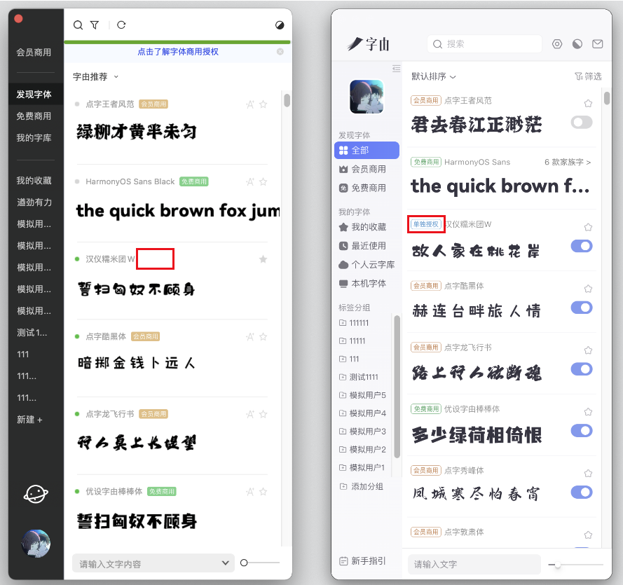 见证奇迹的时刻来了,点击官网上喜欢的字体or案例开关,客户端自动同步激活(此时如果打开了设计软件,字体就会变哦)。