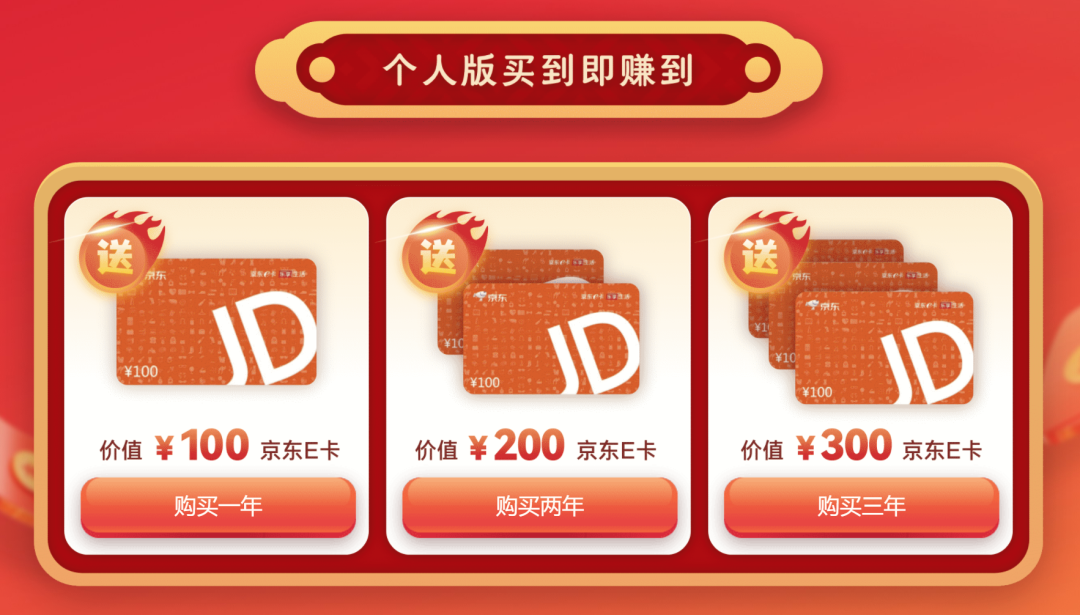 光薅9.9还不够,毕竟字由的忠实会员还没享受到,那就再寄出一王牌大招——京东E卡免费送。去年搞活动,就发现大家都很喜欢送时长,因为可以折现,那今年就直接送你“钱”,个人版会员买一年送一张100的京东E卡,买两年送两张,买三年送三张(以卡密的形式发送到订单详情,绑定账号即可消费)。