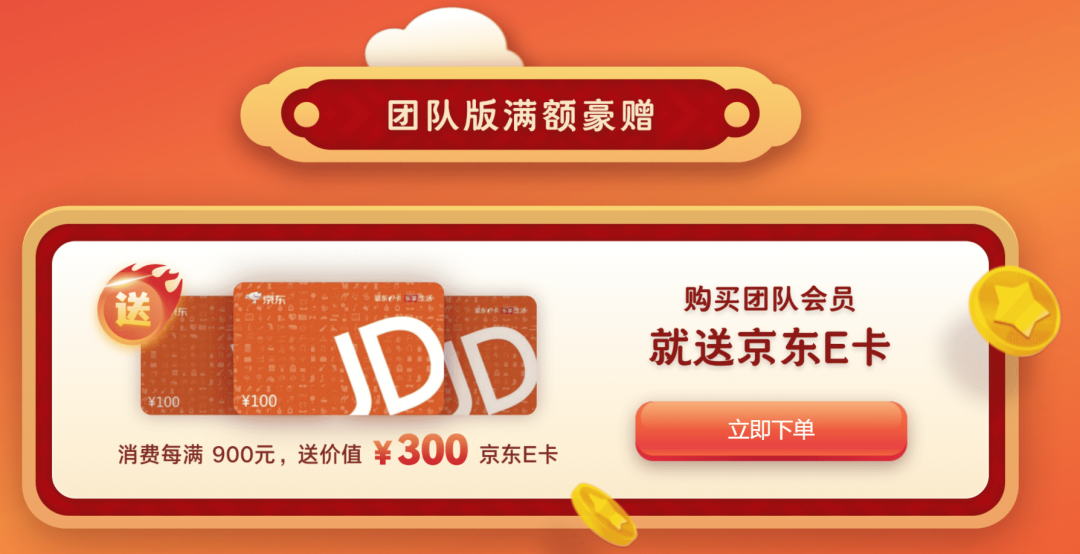 团队版跟个人版送的一样,只是规则稍稍有点区别,每满900送300的京东E卡(卡密直接由团队会员顾问发送),这时候就考验你的乘法学得怎么样了。