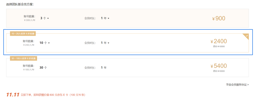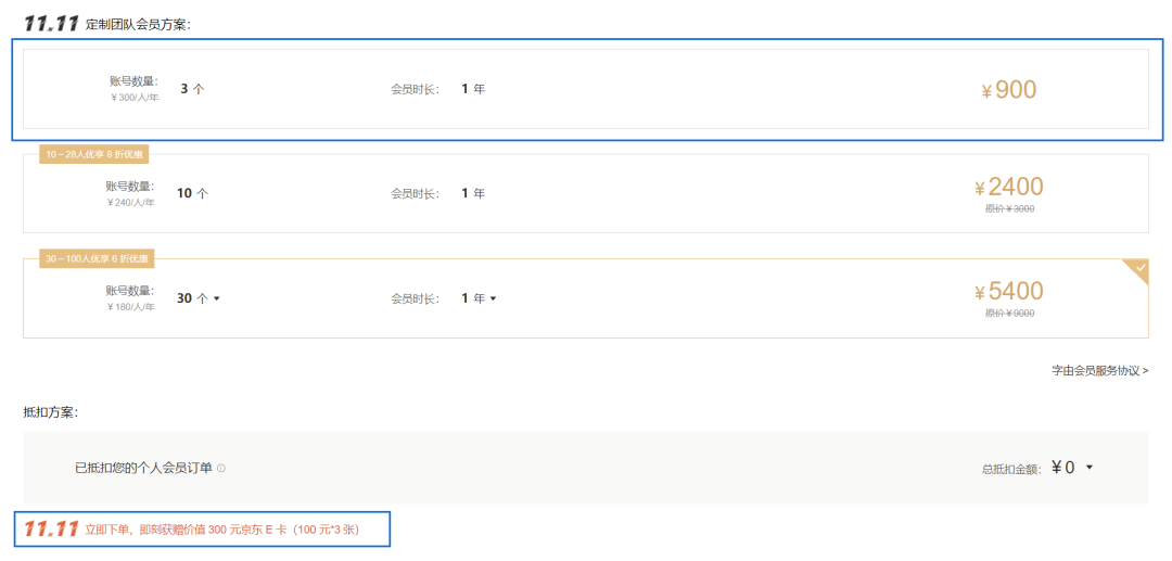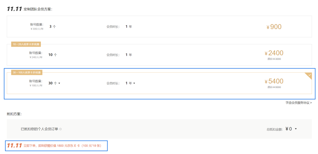 举个栗子,比如我是个人版会员,看到有活动,想升级团队版,但是只要补540多,因为个人版抵扣了一部分,这个时候注意了,系统是按你11.11的新增金额来计算,没有满足900,就不送京东卡,一张也不送(心疼你一秒钟),千万别亏了自己。