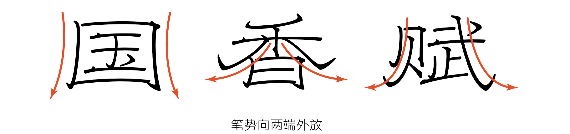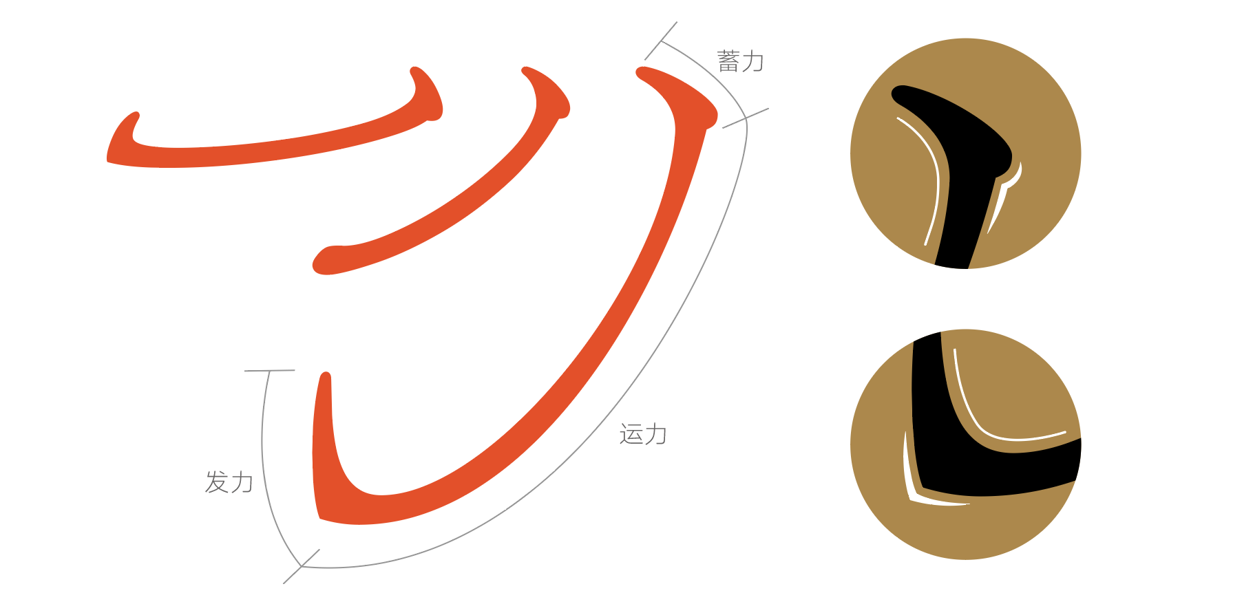捺画的起笔部分低调简约,或简单地提示书写动作,或是直接露锋入笔。收笔的转折处也是外方内圆的设计方式。
