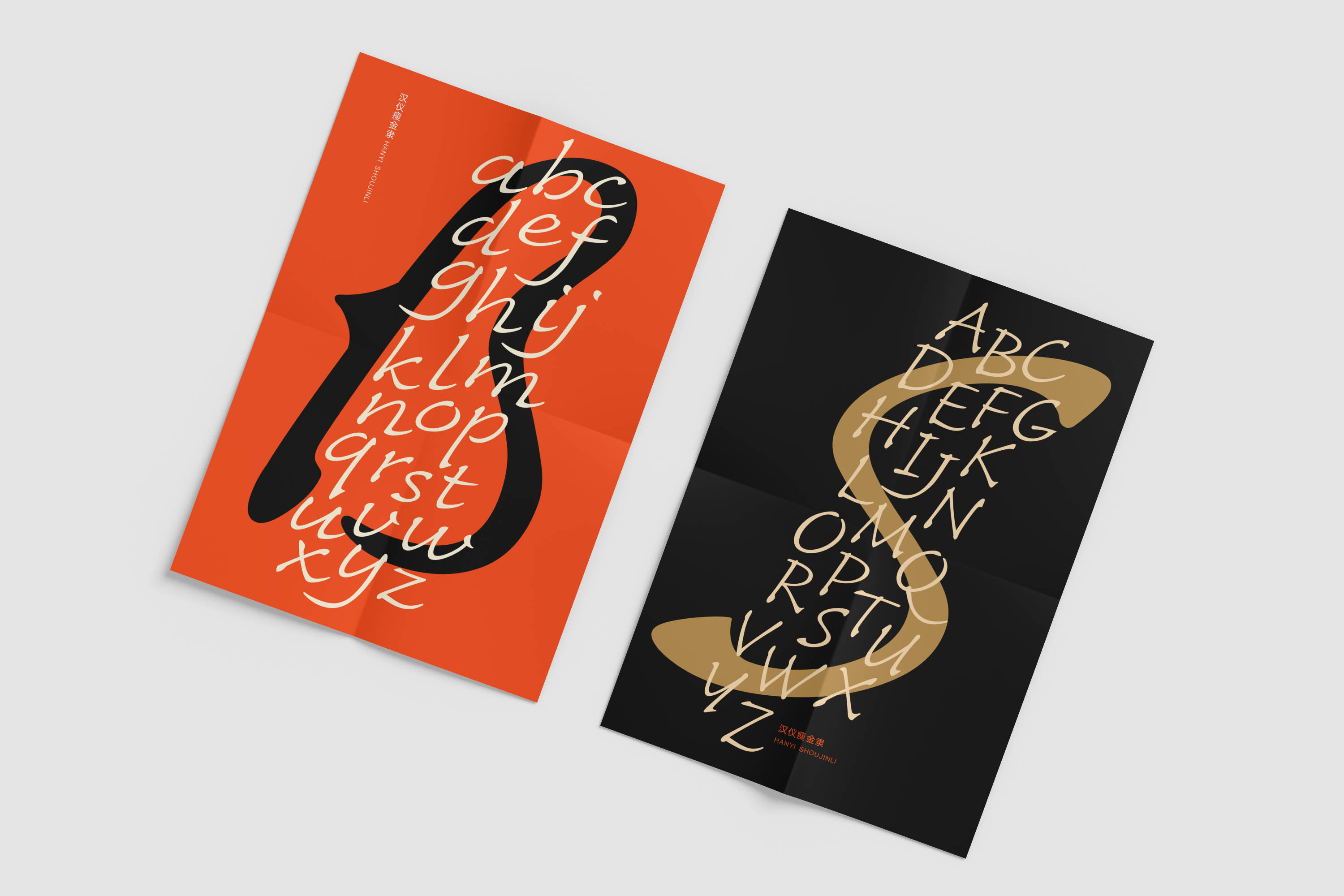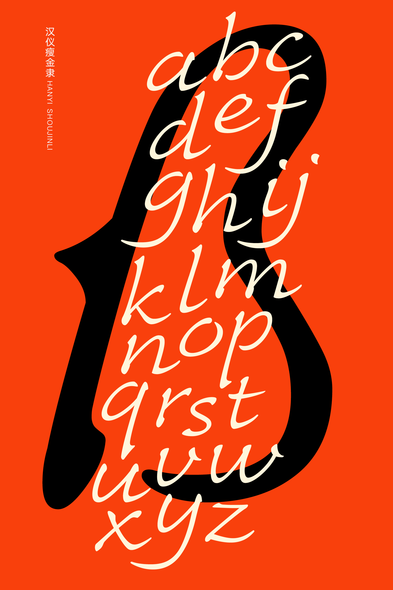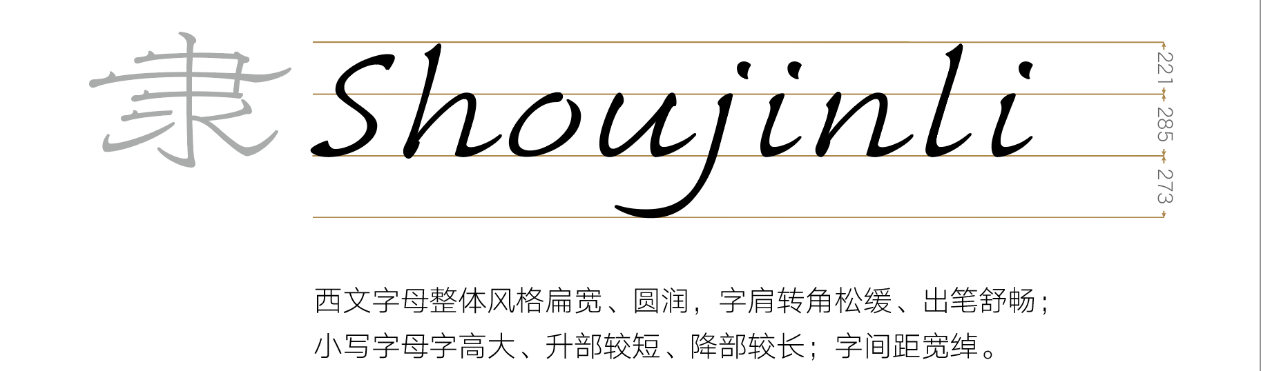 汉仪瘦金隶的西文设计带有手写签名风格,在钢笔的书写方式中加入软笔的特征去呼应中文设计。书写富有弹性,收尾处的笔锋特征明显。较圆润的笔画和转角显得书写速度略慢,笔画间的起笔收笔有顿笔的感觉,并在一些字母上做了断笔处理,保留手写的韵味。字母出笔能展现书写笔势灵动的韵律感,在文字排版时字母之间有似连非连的手写效果,且与中文笔画夸张的装饰感匹配度强。
