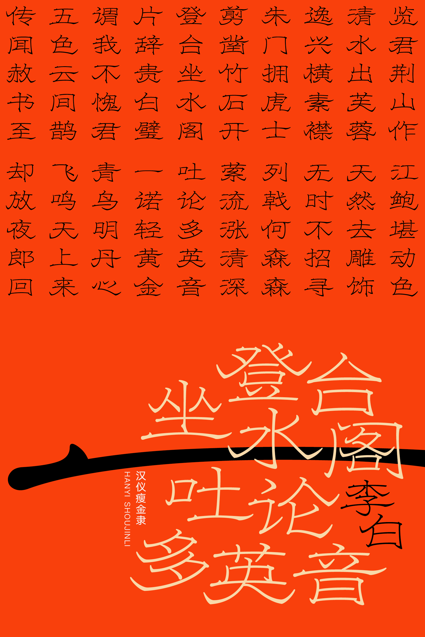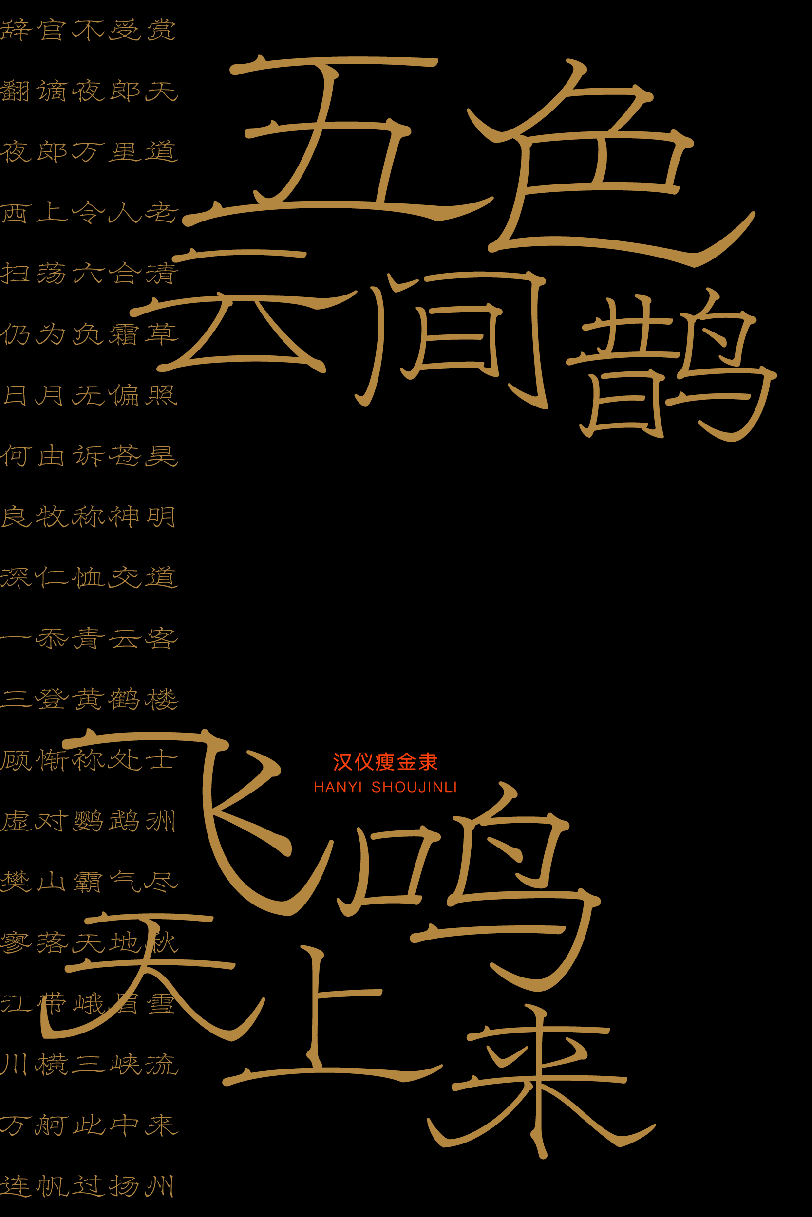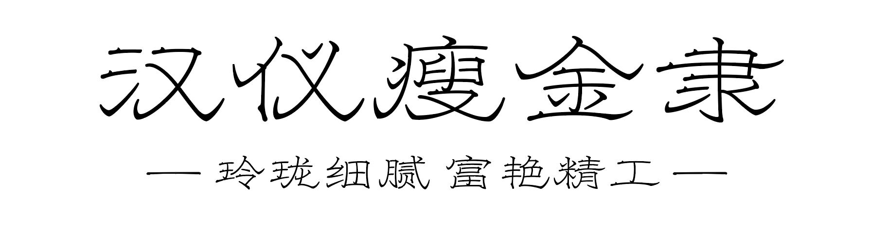汉仪瘦金隶是一款结合了瘦金书和隶书两者特征的创意设计字体,由汉仪签约设计师郭永祥设计。这款字结构参考隶书,造型扁宽,笔画排布均匀、笔势朝左右两侧伸展。笔画设计突出隶书特有的波磔和长掠造型,并吸取了瘦金书顿挫的用笔风格,使字形兼具隶书的华丽与瘦金书的遒美。该字体适合排布较短的文案,装点在作品中以渲染中式、华丽的氛围。