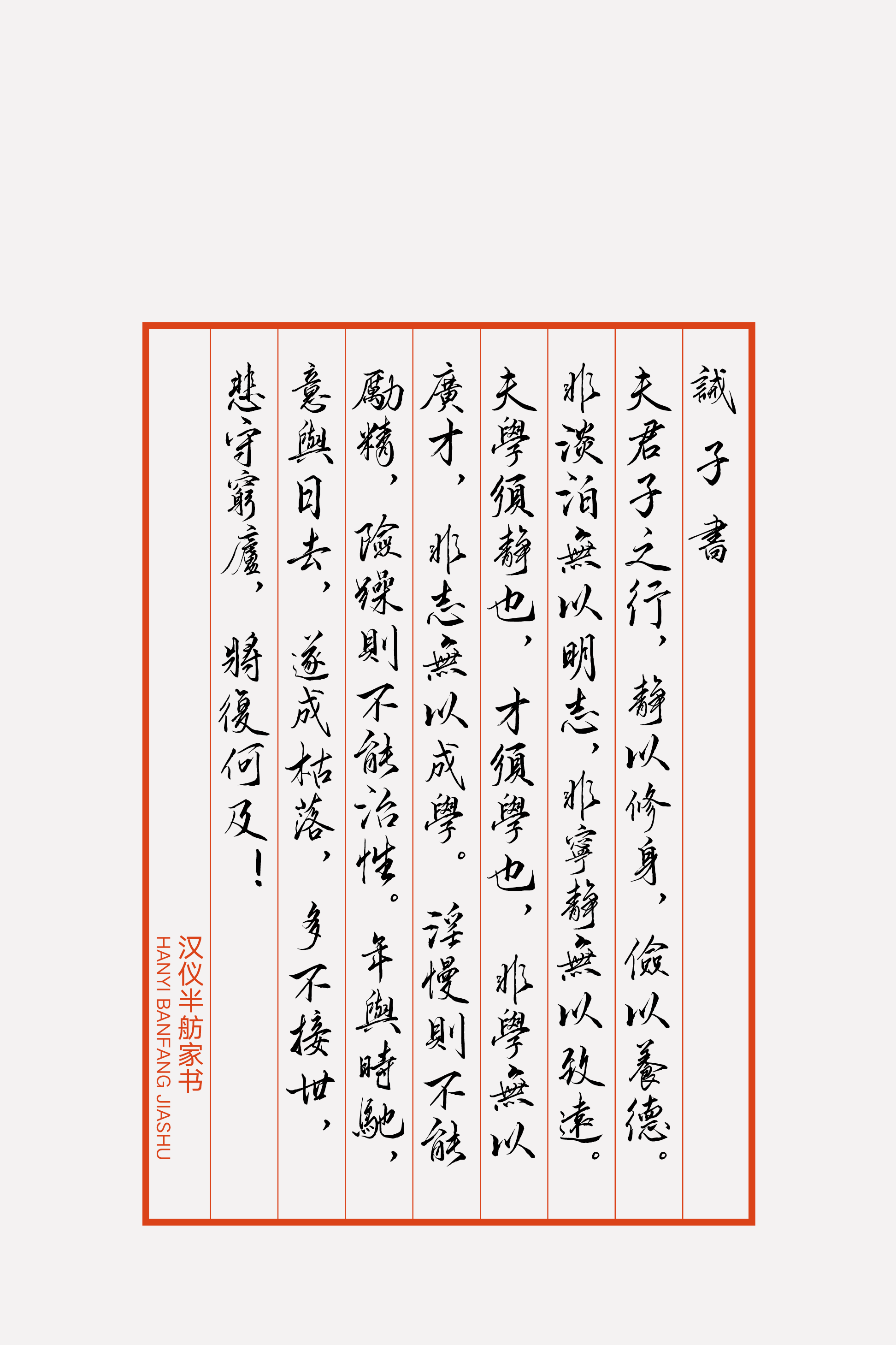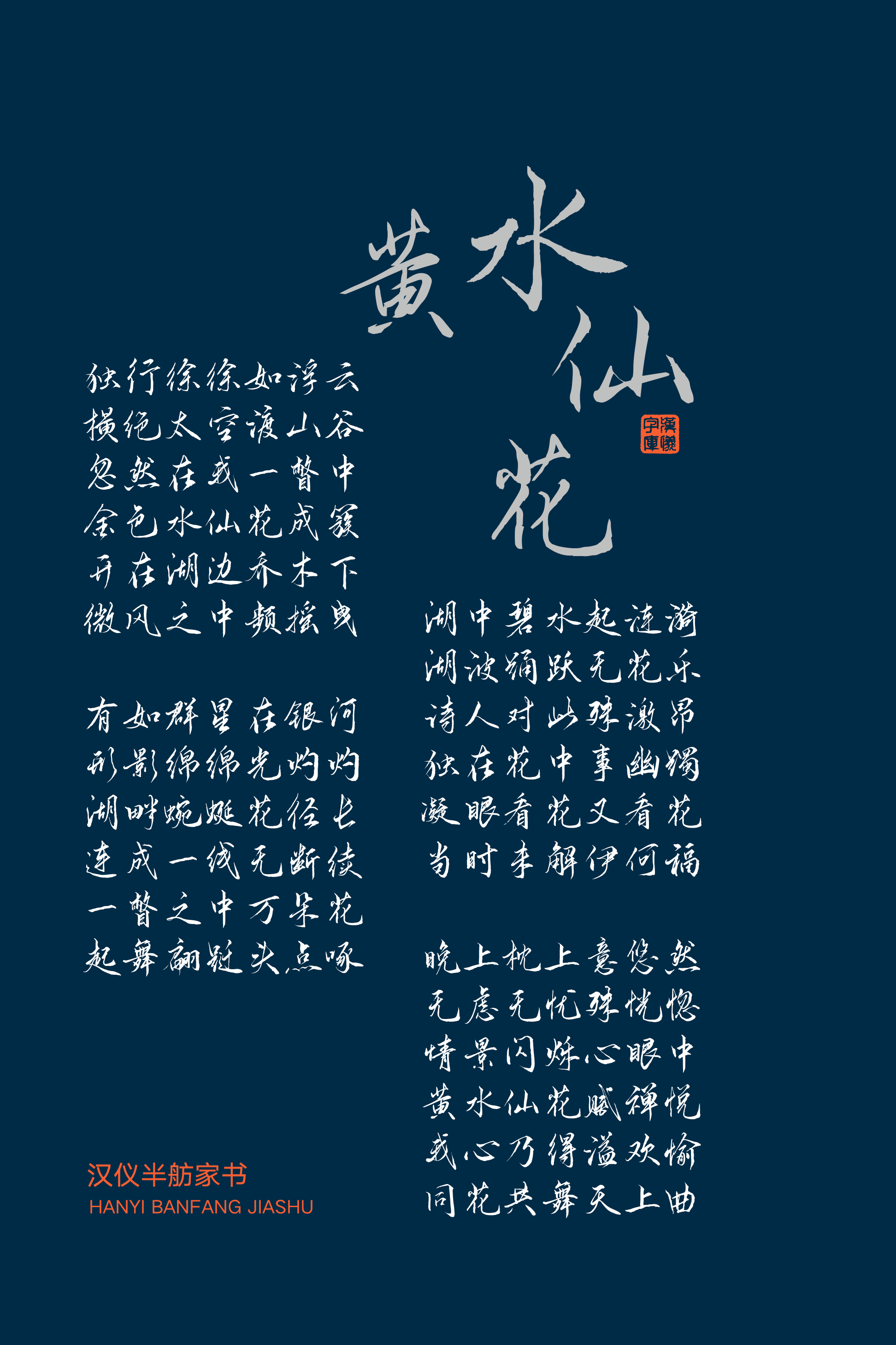 汉仪半舫家书是一款古味淡雅、俊逸灵秀的字体。字体的整体态势均向右上方倾斜,字形飘逸,气势流畅。