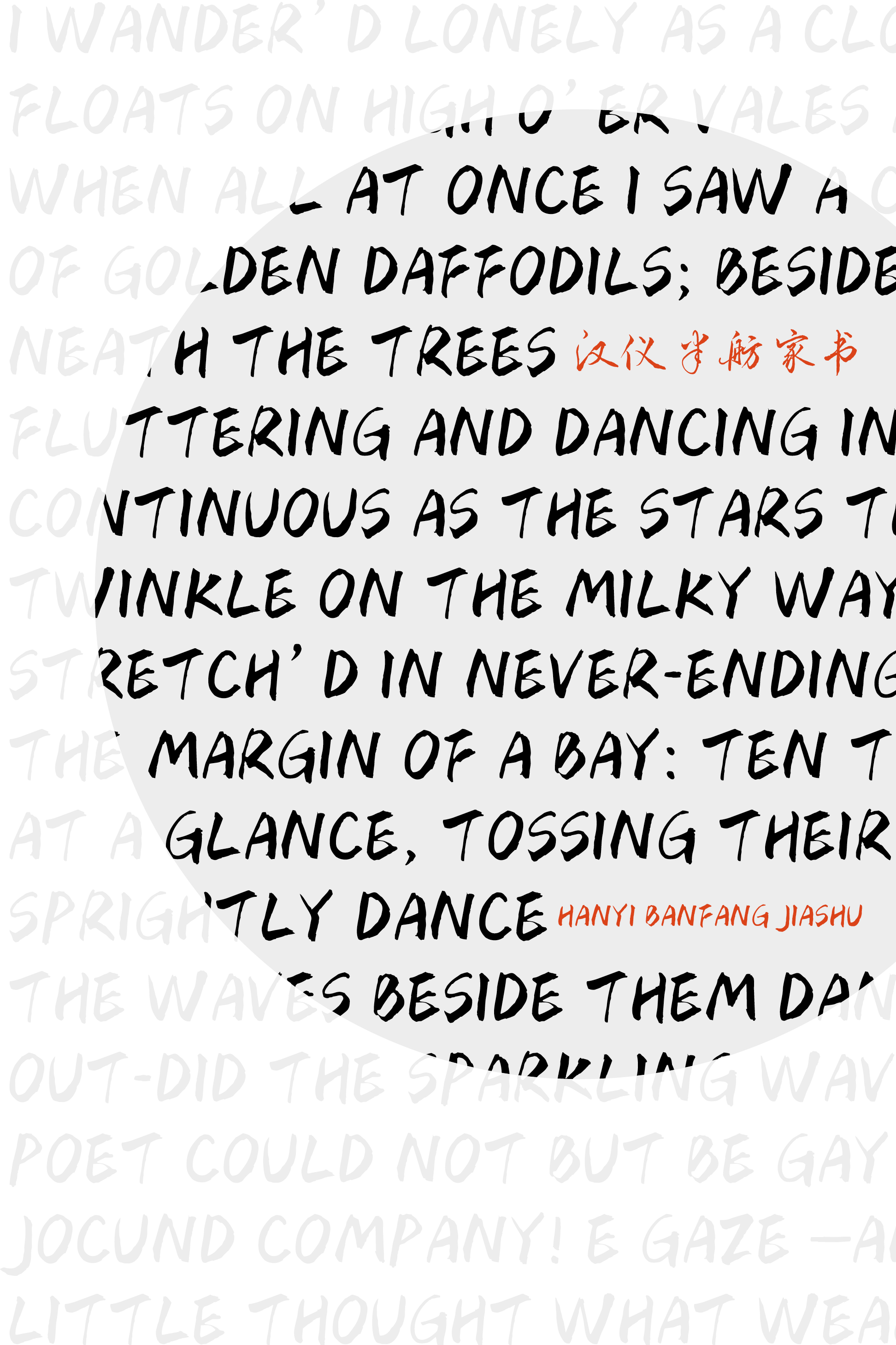 汉仪半舫家书的西文同样用秀丽笔书写,融入了中文书法的手写方式。笔触丰富,运笔流畅,手写感强,中西文的搭配和谐统一。